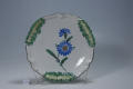 Додаток до назва (лист, ...): Сухарниця кругла пласка, з узорним бортом. По борту у трьох місцях рельєфний декор жовтувато-зеленого кольору. Центральна частина декорована зображеням волошки./Авторські підписи, клейма: на зворотньому боці денця надполивна марка коричневого кольору: