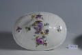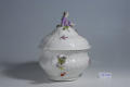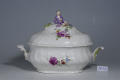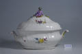 Авторські підписи, клейма: Марка синя підглазурна/Кількість: 1/Опис: Ваза для супу з кришкою, овальної форми, розроблена ребрами; по борту - плетениця; розпис: букети, один з великою жовтою, другий - лиловою квіткою; ручки у вигляді пальмет з лиловою каймою. Кришка увінчана фігурою хлопчика, який сидить, у бузковому кафтані, в оточенні ліплених квітів.