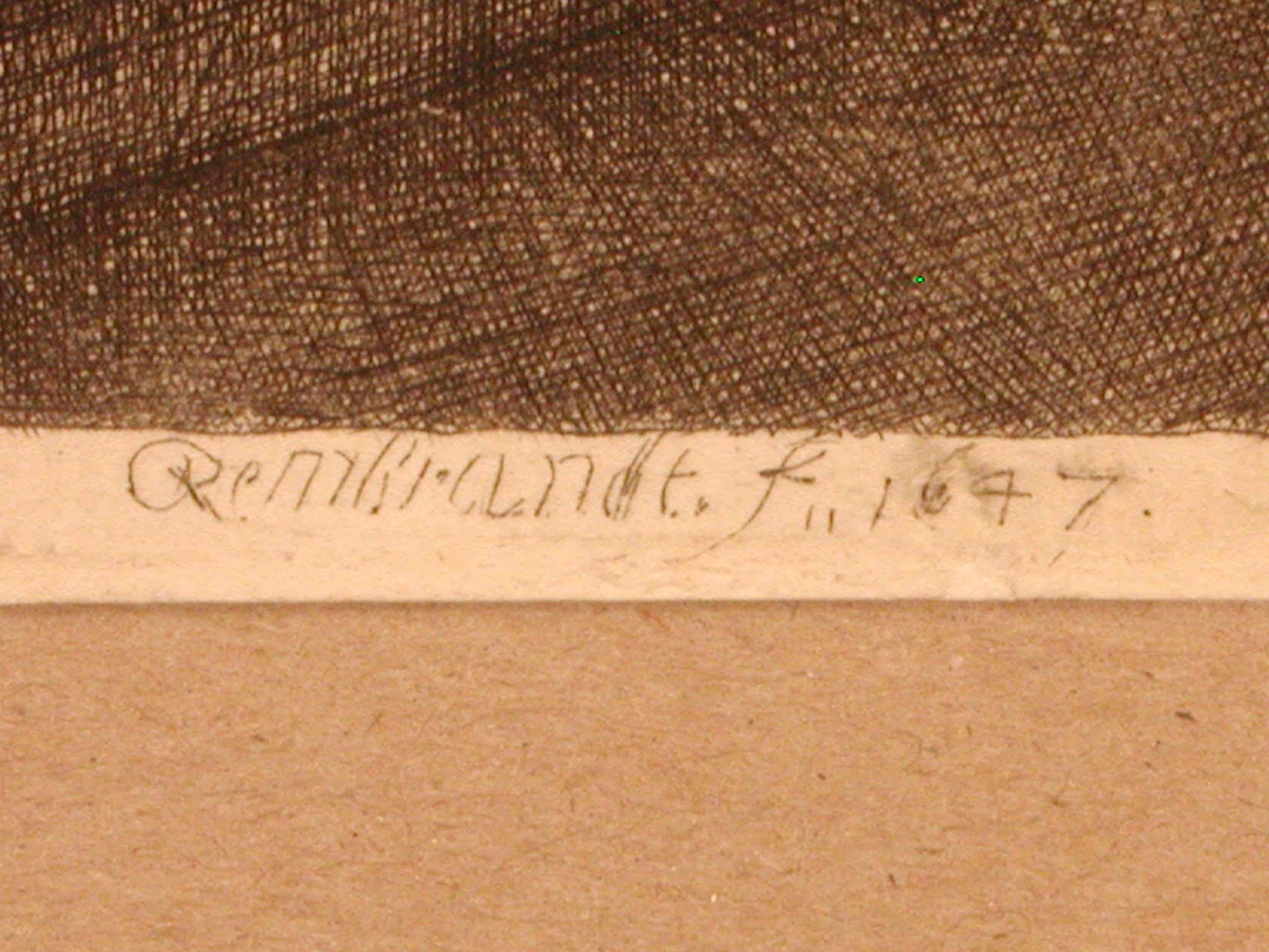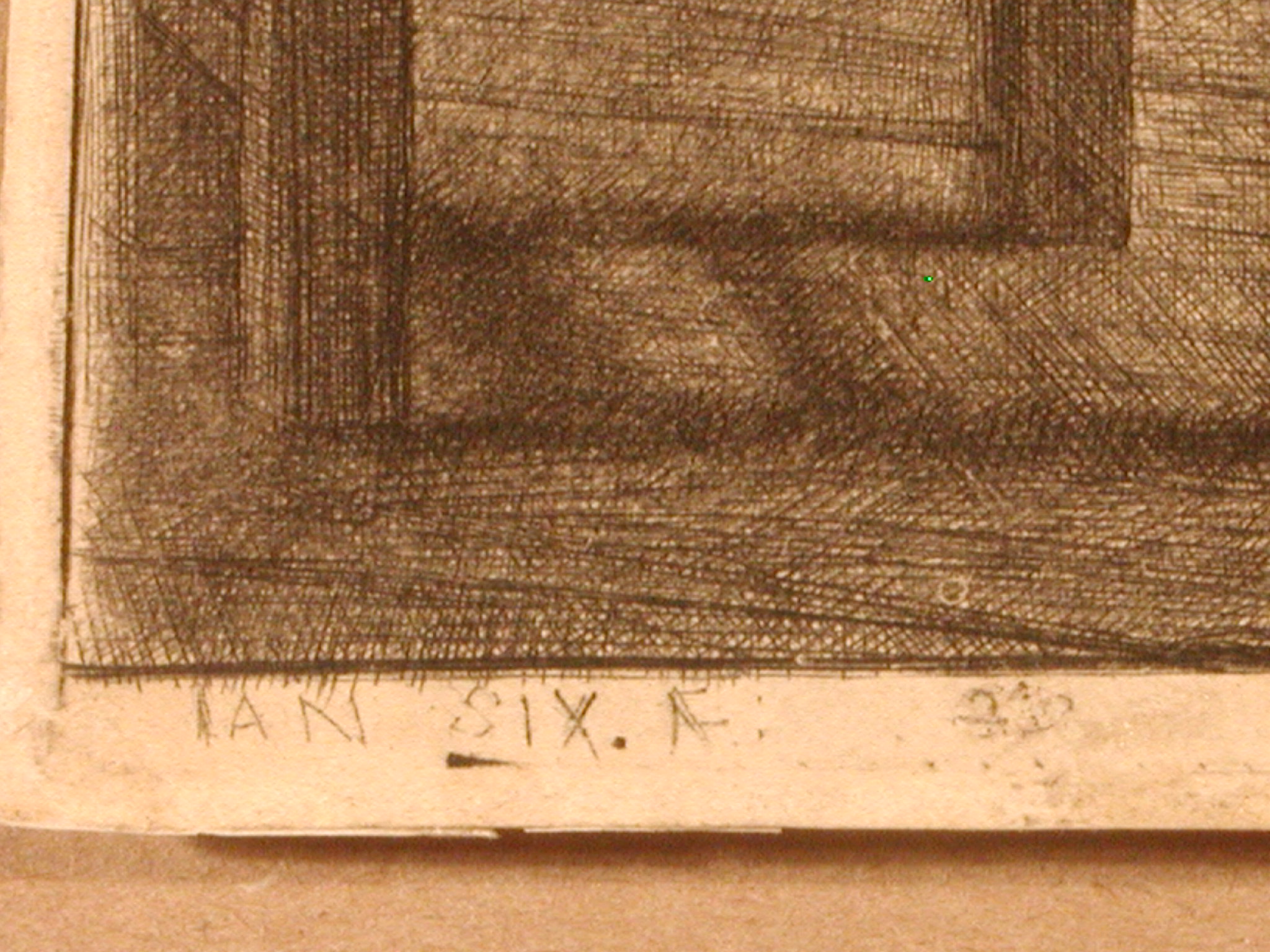 Поля обрізані, аркуш дубльований, у кутах реставраторські заправки, сильно потертий, на звороті біля країв сліди клею і наклеєного паперу; на чолі у Сикса рожевувата пляма.,