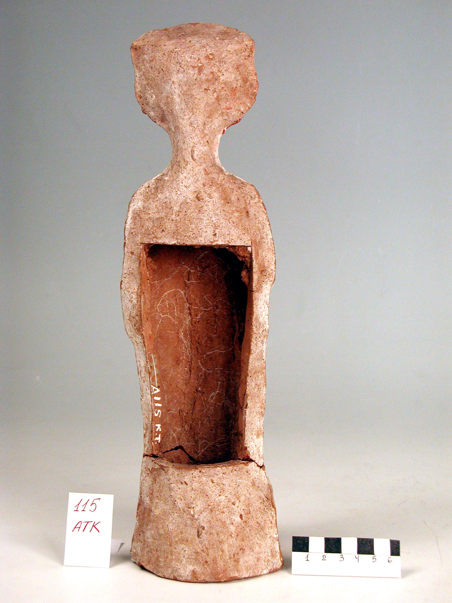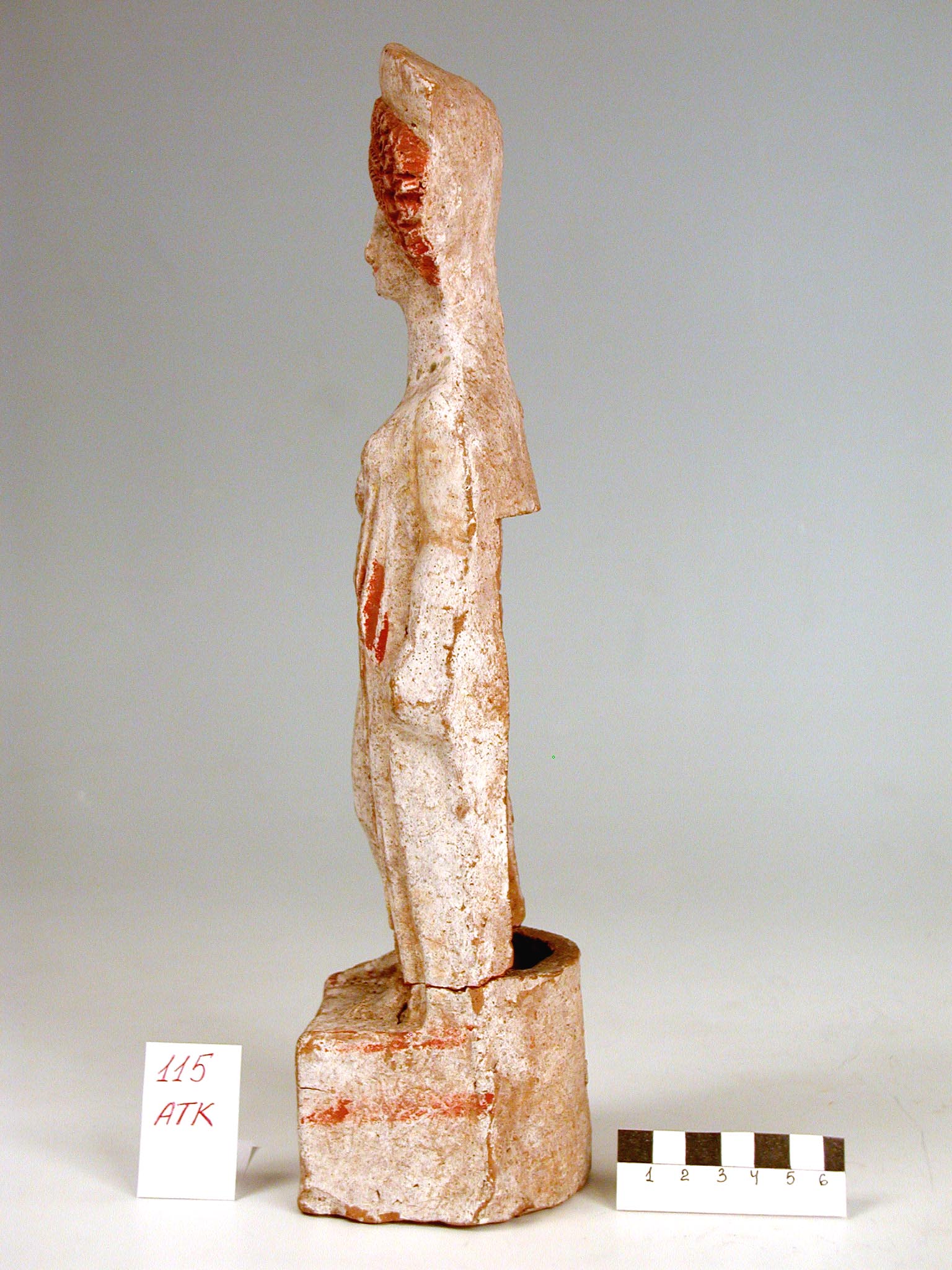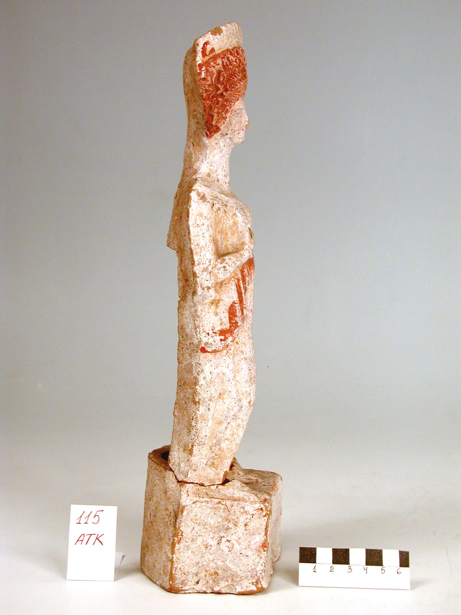 Додаток до назва (лист, ...): На ній хітон з короткими широкими рукавами. Складки хітона, що падають прямими лініями, трактовані дещо архаїчно. Правою рукою вона торкається грудей, ліва опущена вздовж корпуса. Права нога злегка зігнута в коліні. Моделювання грубе. В різних місцях сліди розфарбування. Вздовж борта видно жовтий меандровий візерунок. Нижче зелена смуга, ще нижче червона смуга. Навколо шиї зелене намисто. Очі наведені чорною фарбою, губи - червоною. Волосся червоно-коричневе. На високому постаменті паралельні червоні смуги. Майже вся задня сторона статуетки вирізана./Кількість: 1/Старі документи прийому: У чинній інвентарній книзі старі документи надходження не вказані./Опис: На ній хітон з короткими широкими рукавами. Складки хітона, що падають прямими лініями, трактовані дещо архаїчно. Правою рукою вона торкається грудей, ліва опущена вздовж корпуса. Права нога злегка зігнута в коліні. Моделювання грубе. В різних місцях сліди розфарбування. Вздовж борта видно жовтий меандровий візерунок. Нижче зелена смуга, ще нижче червона смуга. Навколо шиї зелене намисто. Очі наведені чорною фарбою, губи - червоною. Волосся червоно-коричневе. На високому постаменті паралельні червоні смуги. Майже вся задня сторона статуетки вирізана.