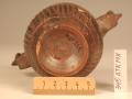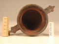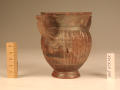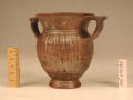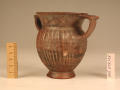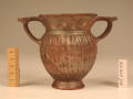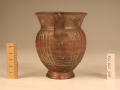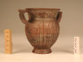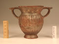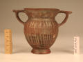 Додаток до назва (лист, ...): Верхня частина тулова коротка зі злегка відігнутим назовні краєм і стінками, що розходяться. На ній між ручками розведеною білою фарбою нанесена гілочка плюща. Рельєфна лінія відділяє верхню частину тулова від значно більшої нижньої з опуклими стінками, прикрашеними вертикальними рельєфними лініями (на 3/4). Під ручками три врізні лінії, які розходяться. Ручки пласкі (ледь помітно ввігнуті) з двома рельєфними пелюстками, що виступають. Ніжка висока профільована. Дно опукле з рельєфною цяткою в центрі. Бурим блискучим лаком вкрита вся поверхня, внутрішня сторона верхньої частини тулова і дно./Кількість: 1/Опис: Верхня частина тулова коротка зі злегка відігнутим назовні краєм і стінками, що розходяться. На ній між ручками розведеною білою фарбою нанесена гілочка плюща. Рельєфна лінія відділяє верхню частину тулова від значно більшої нижньої з опуклими стінками, прикрашеними вертикальними рельєфними лініями (на 3/4). Під ручками три врізні лінії, які розходяться. Ручки пласкі (ледь помітно ввігнуті) з двома рельєфними пелюстками, що виступають. Ніжка висока профільована. Дно опукле з рельєфною цяткою в центрі. Бурим блискучим лаком вкрита вся поверхня, внутрішня сторона верхньої частини тулова і дно.