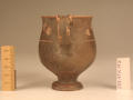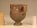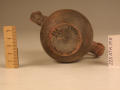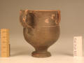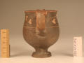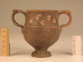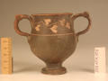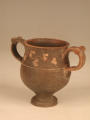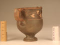 Додаток до назва (лист, ...): Вінця злегка відігнуті назовні. Тулово заглибленою лінією розділене на дві, майже рівні, частини. Верхня з ледь ввігнутими стінками переходить в нижню - опуклу. Ручки невеликі. Розташовані вони по обидва боки посудини у вигляді округлих петельок, прикрашених зверху двома рельєфними виступами - кружечками. Вся поверхня (всередині і зовні) вкрита чорним лаком, який отримав місцями червонувато-буроватий відтінок. Верхня частина посудини опоясана гілкою плюща. Листя виконане накладною білою фарбою, стебло - тонкою врізною лінією./Кількість: 1/Опис: Вінця злегка відігнуті назовні. Тулово заглибленою лінією розділене на дві, майже рівні, частини. Верхня з ледь ввігнутими стінками переходить в нижню - опуклу. Ручки невеликі. Розташовані вони по обидва боки посудини у вигляді округлих петельок, прикрашених зверху двома рельєфними виступами - кружечками. Вся поверхня (всередині і зовні) вкрита чорним лаком, який отримав місцями червонувато-буроватий відтінок. Верхня частина посудини опоясана гілкою плюща. Листя виконане накладною білою фарбою, стебло - тонкою врізною лінією.