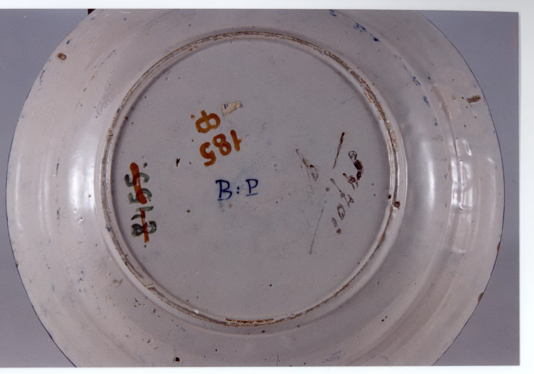 Додаток до назва (лист, ...): Блюдо кругле, декоровано китаїзованим сюжетним розписом, який повнюстю вкриває поверхню./Авторські підписи, клейма: на денці синя підполивна марка: В:Р.