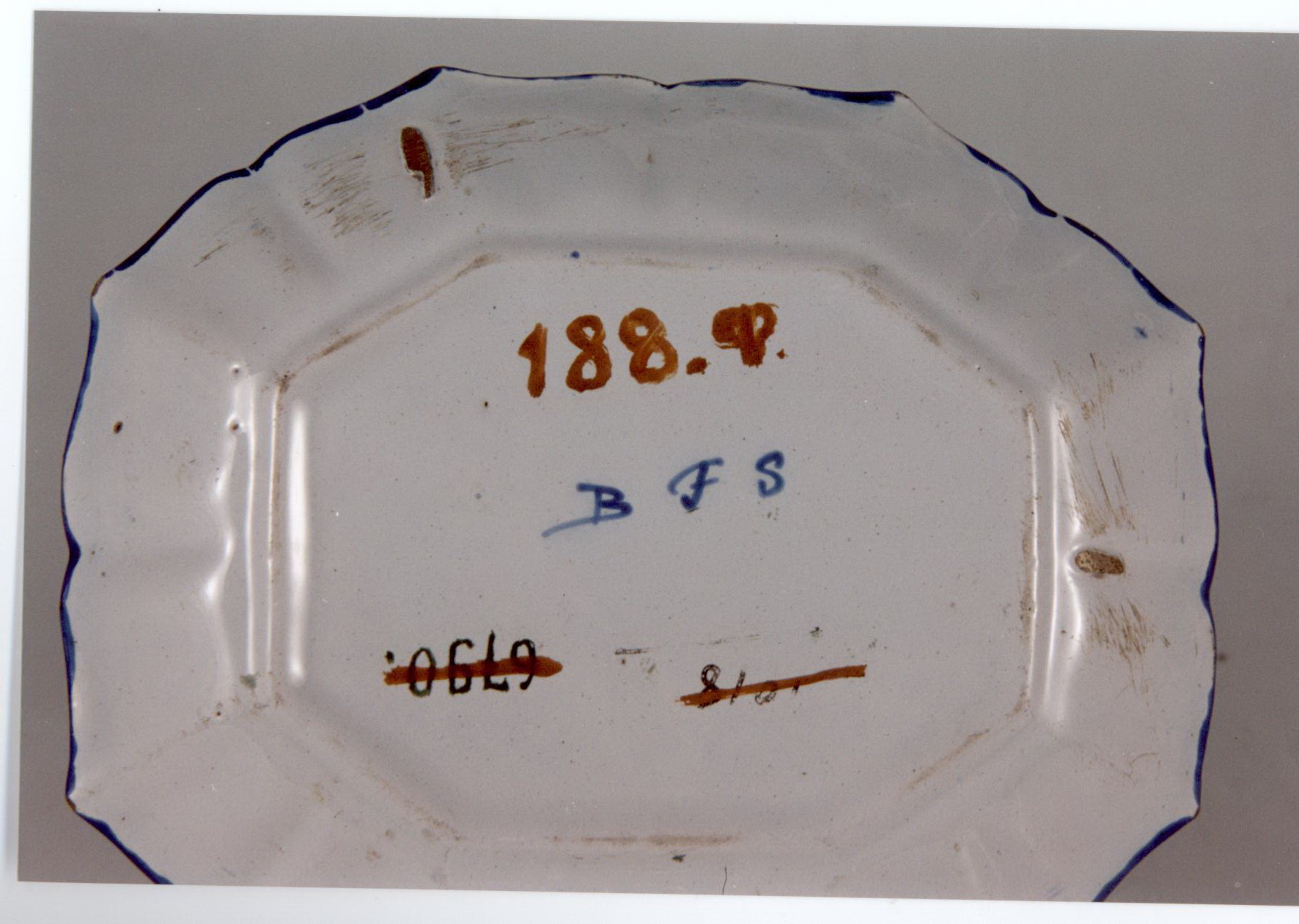 Додаток до назва (лист, ...): Блюдо маленьке, восьмикутне з хвилястим бортом.вся поверхня вкрита стилізованим рослинним розписом, у центрі зображено кошик з фруктами, на якому сидять два птаха./Авторські підписи, клейма: на денці синя підполивна марка: B F S/Кількість: 1/Старі документи прийому: Акт від 14.04.1934 р.