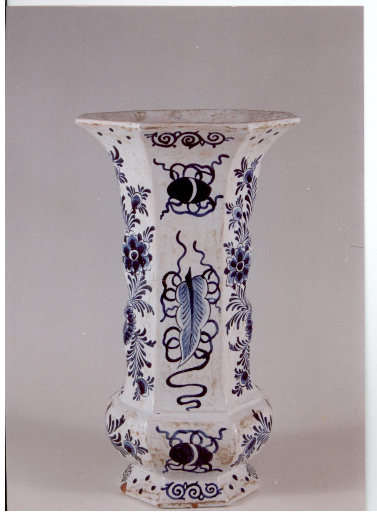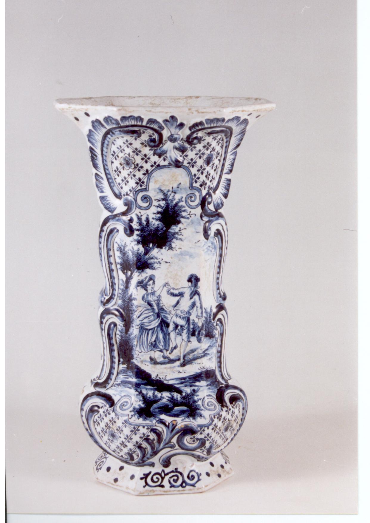 Додаток до назва (лист, ...): Ваза слющеної восьмигранної форми з двома перехватими у нижній частині, та широко розгорнутими вінцями. Лицевий бік вази декорований зображенням танцюючої пари у рельєфному картуші./Авторські підписи, клейма: на денці синя підполивна марка: W/Кількість: 1