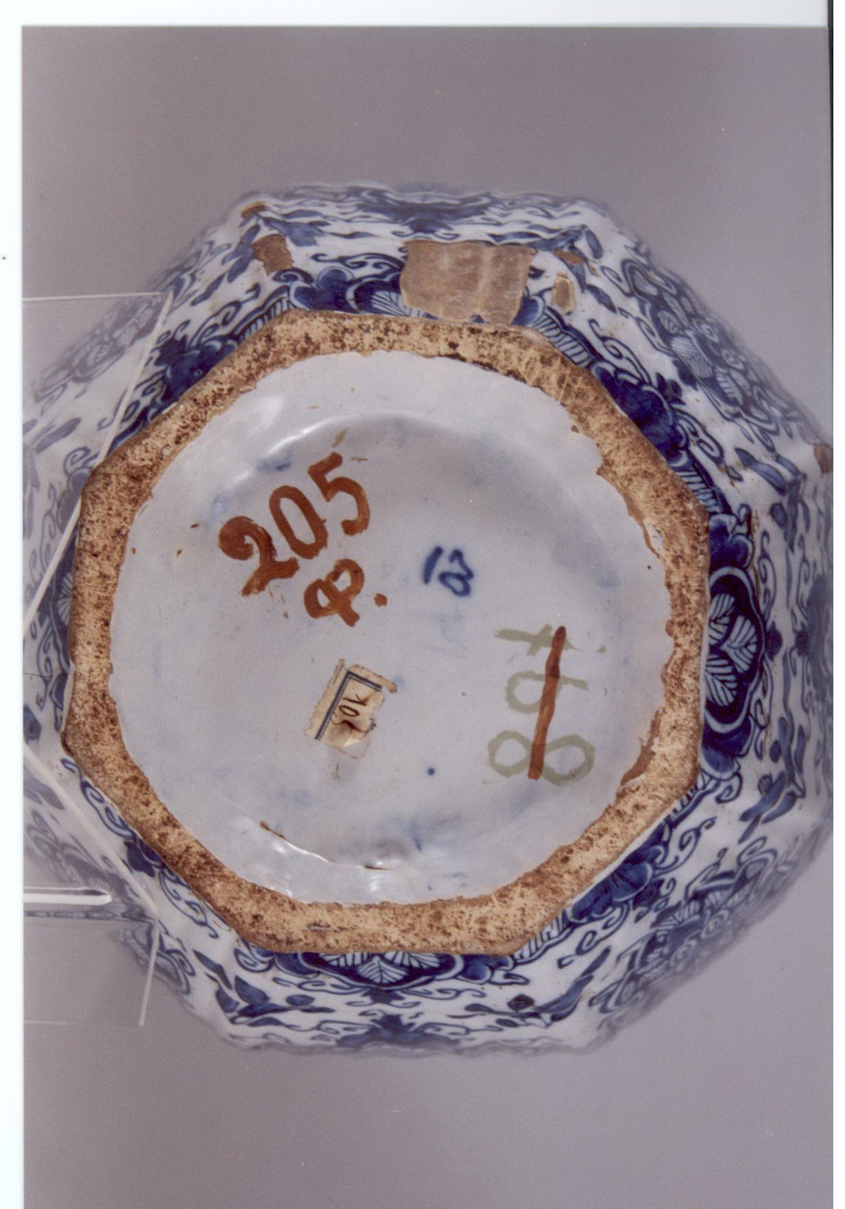 Додаток до назва (лист, ...): Ваза овальної восьмигранної форми.Тулуб вази декорований китаїзованим розписом. кришка завершується фігурою собаки, який сидить./Авторські підписи, клейма: на денці синя пілполивна марка/Кількість: 1/Зв'язок з іншими предм. музею: кришка на вазі в "Кабінеті Ханенка"