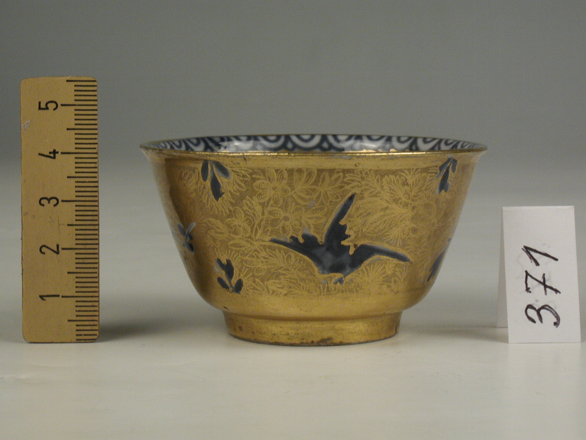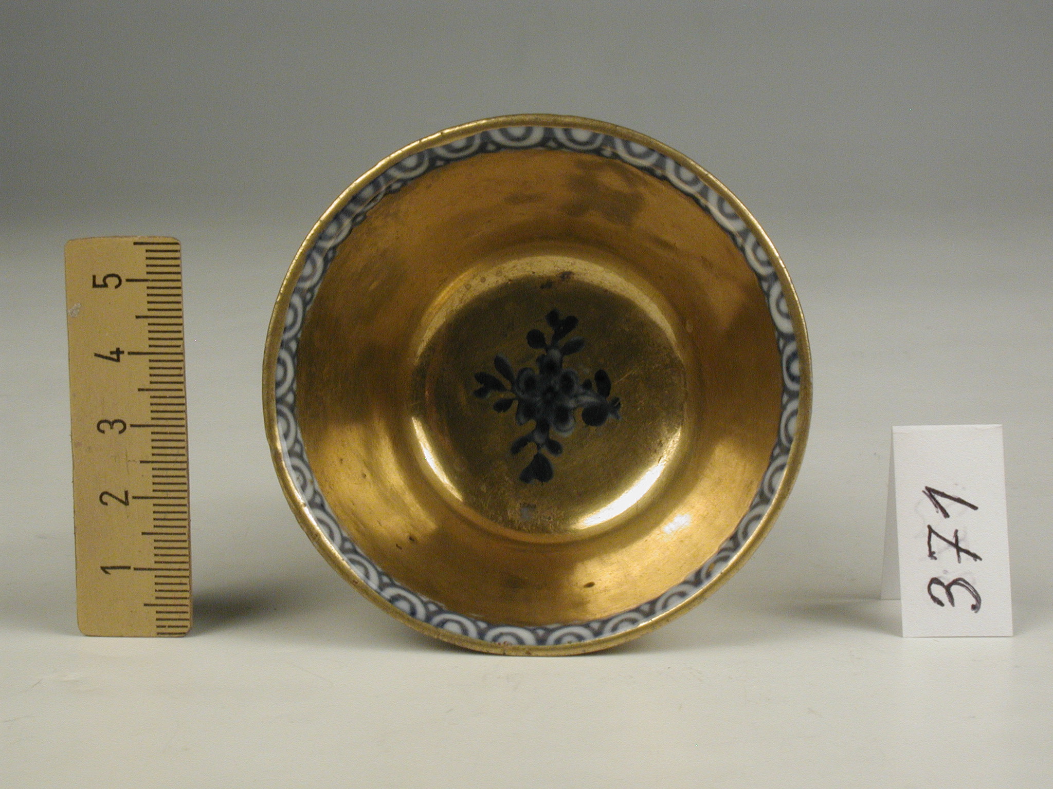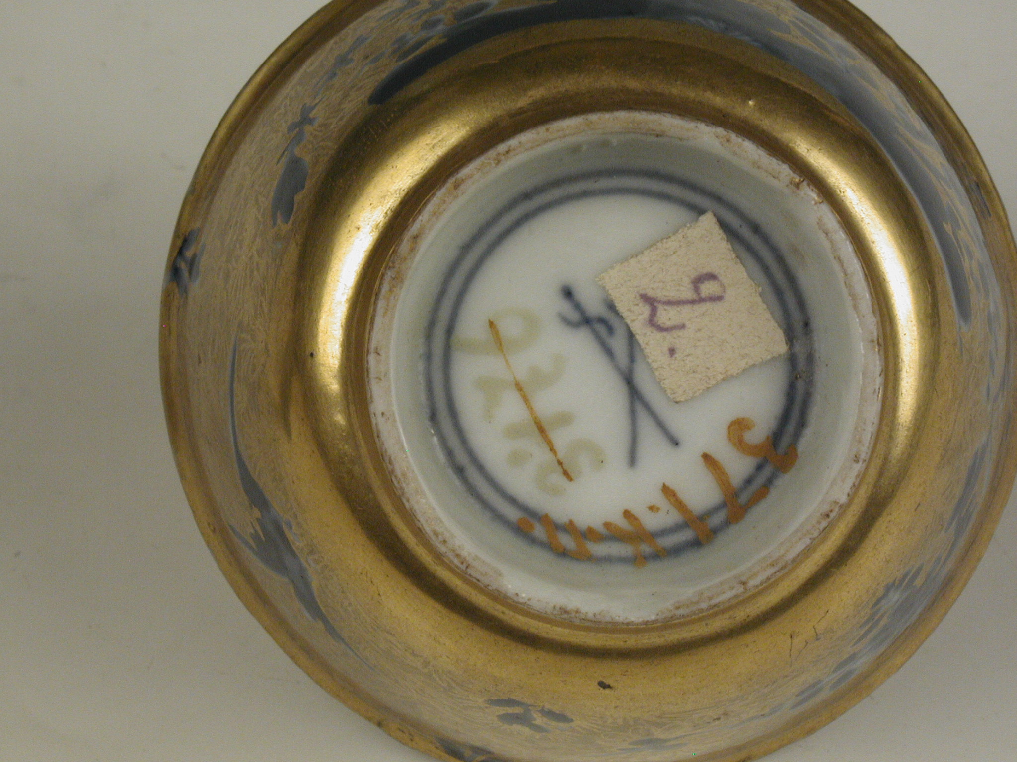 Авторські підписи, клейма: марка синя підглазурна: схрещені мечі/Історія Атрибуціi: консультація Р.С. Соловейчик (Ермітаж, 1961 р.) - Мейсен, перша половина 18 ст. (розпис золотом поза заводом)/Кількість: 1/Зв'язок з іншими предм. музею: до сервізу 371 - 380 ПК МХ