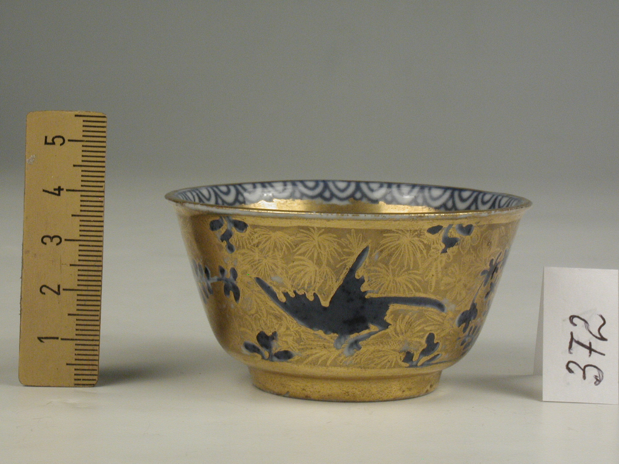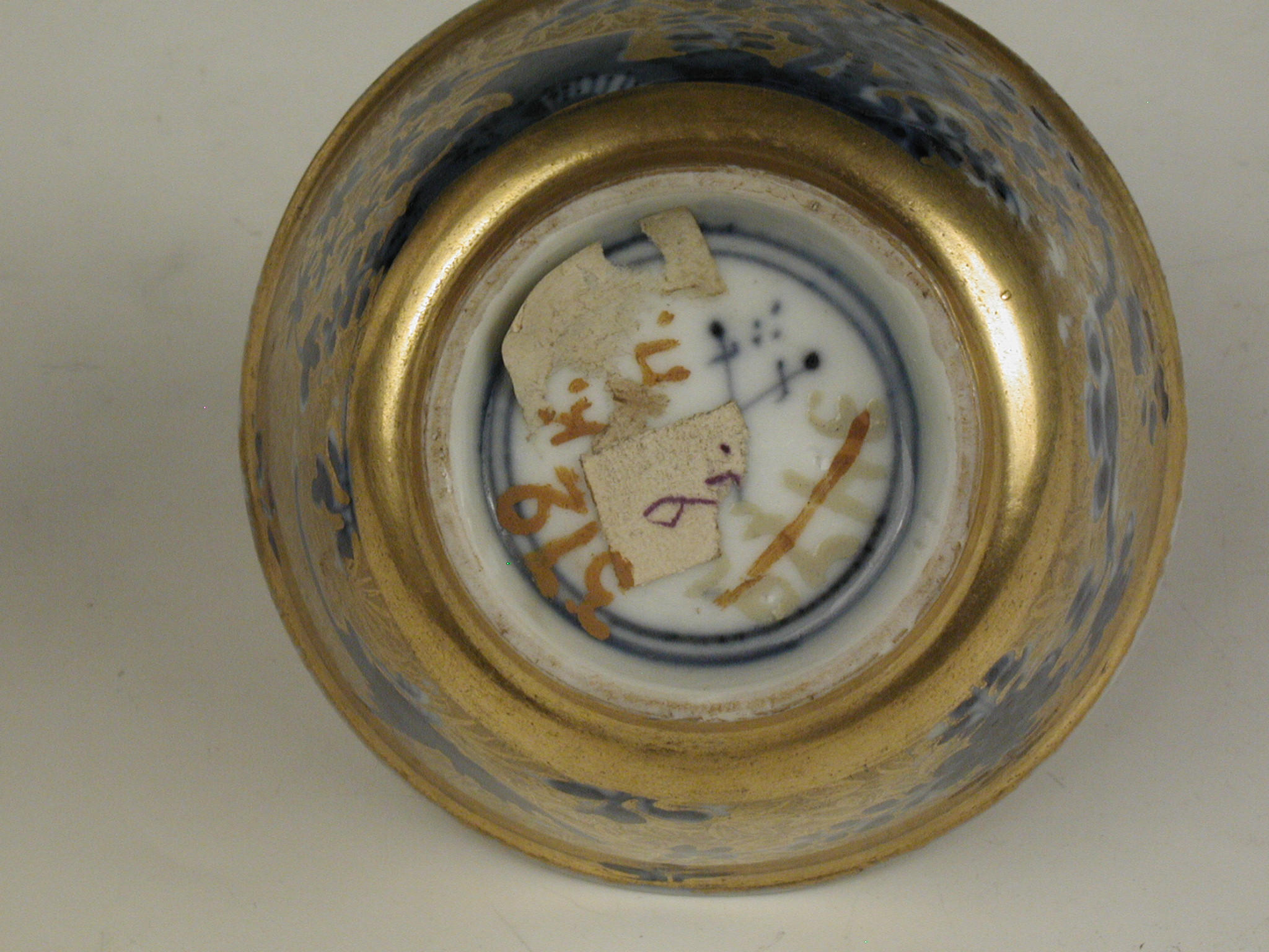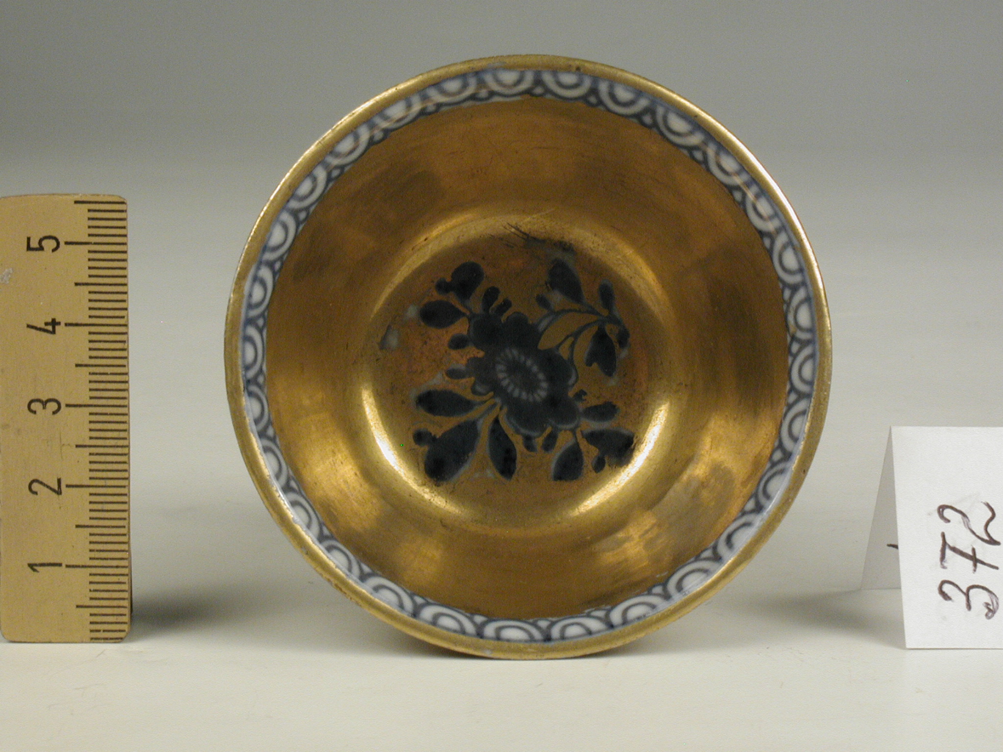 Авторські підписи, клейма: марка синя підглазурна: схрещені мечі/Історія Атрибуціi: консультація Р.С. Соловейчик (Ермітаж, 1961 р.) - Мейсен, перша половина 18 ст. (розпис золотом поза заводом)/Кількість: 1/Зв'язок з іншими предм. музею: до сервізу 371 - 380 ПК МХ