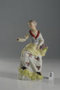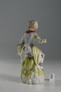 Закладка “Атрибуція” - Змiн. Написи, клейма, марки: Без марки/Змiн.опис: Дівчина з корзиною винограду сидить на виступі підніжжя, повернувши голову вправо та піднявши праву руку; на ній біла сорочка з червоною хусткою, блакитний корсаж, біла, розписана "індіанськими" квітами спідниця; через її праве стегно перекинуто жовте драпіювання. Підніжжя високе, розписане під дерен./Змiн. час створення: XVIII ст. (?)місце створення, школа: ТюрінгіяНовый материал: порцелянаИзм. техника: надглазурний поліхромний розпис