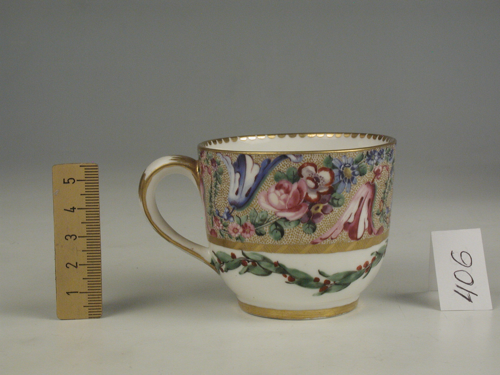 Додаток до назва (лист, ...): циліндричної форми/Авторські підписи, клейма: марка в тісті/Історія Атрибуціi: консультація Р.С. Соловейчик (Ермітаж, 1961 р.) - Севр, 18 ст. (мяка порцнляна)/Кількість: 1/Зв'язок з іншими предм. музею: блюдце 407 ПК МХ