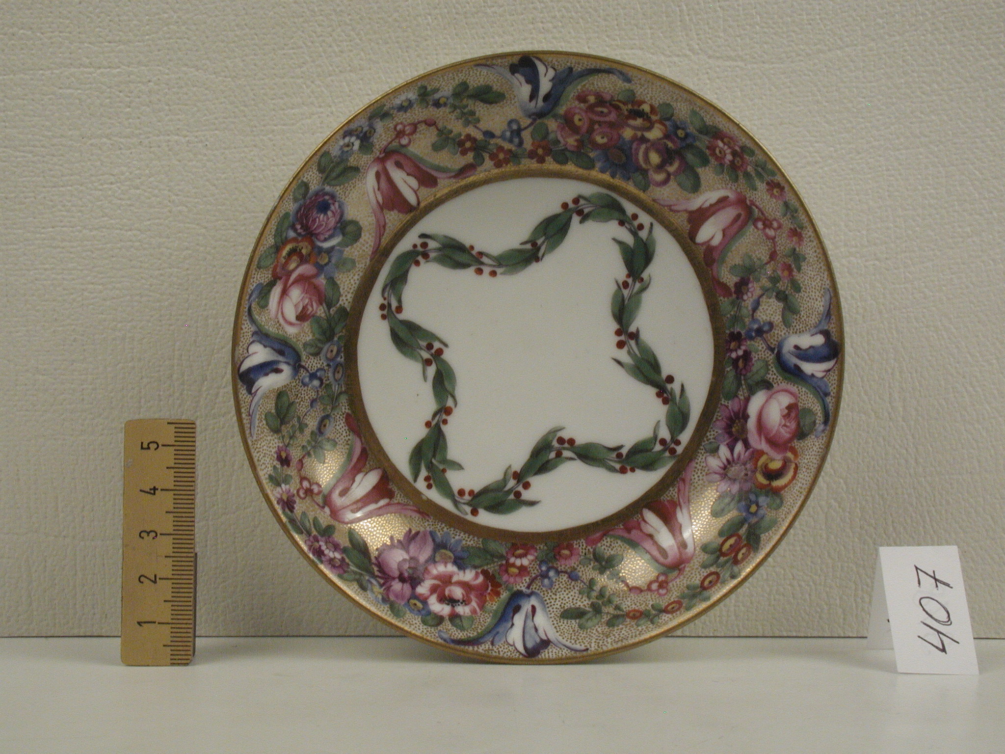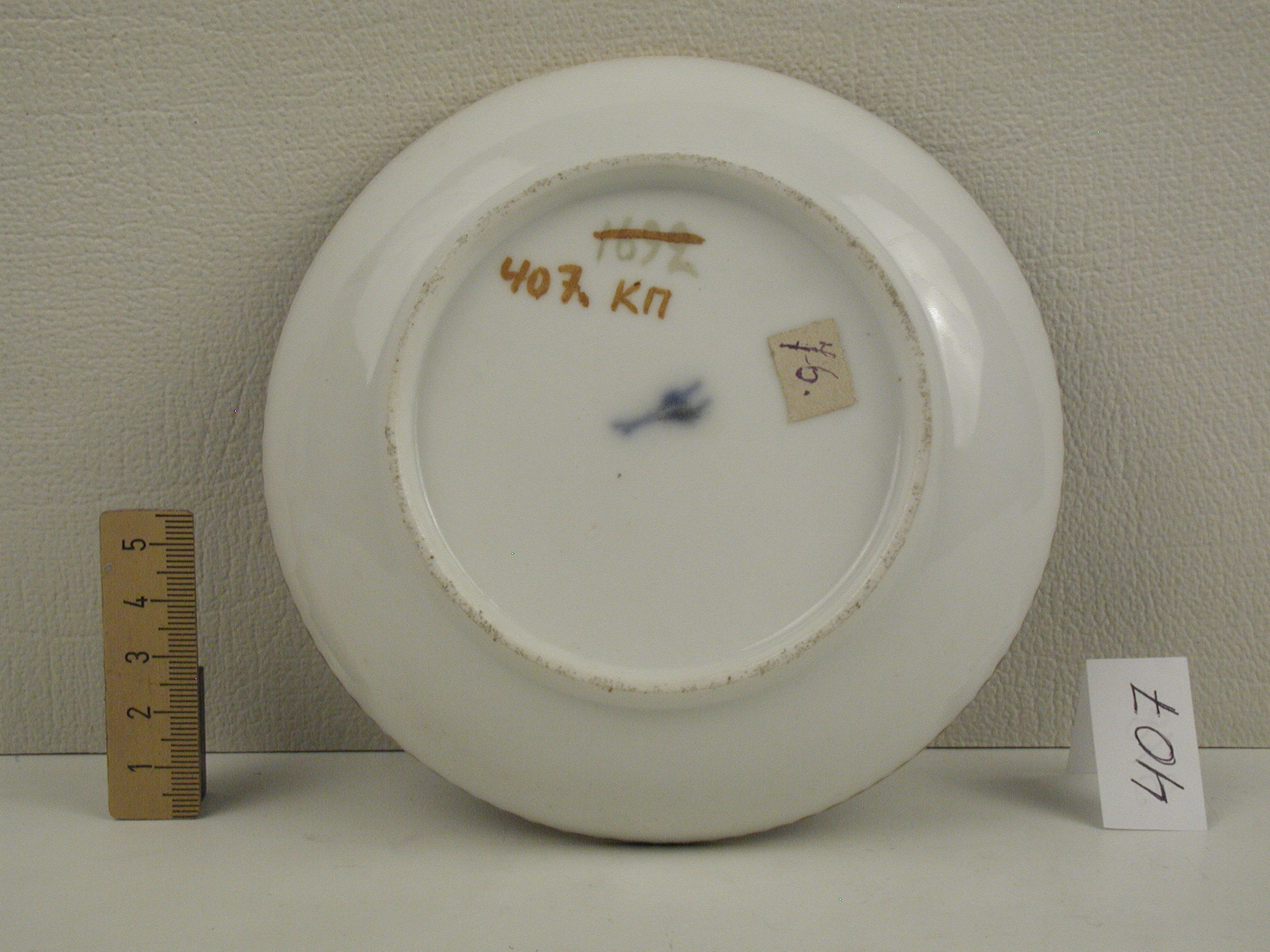 Авторські підписи, клейма: марка синя підглазурна/Історія Атрибуціi: консультація Р.С. Соловейчик (Ермітаж, 1961 р.) - Франція, можливо кінець 18 ст. (дороблення до чашки, тверда порцеляна. Розпис наслідує порцеляну Севра. Марка паризької мануфактури Лекре)/Кількість: 1/Зв'язок з іншими предм. музею: чашка 406 ПК МХ