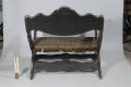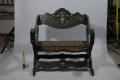 Додаток до назва (лист, ...): Крісло чорного дерева, широке, низьке з відігнутою назад спинкою. Підлокотники у вигляді вертикально вигнутих дошок, які закінчуються жіночими головами у шеломах. Декоровано інкрустацією слоновою кістко./Кількість: 1