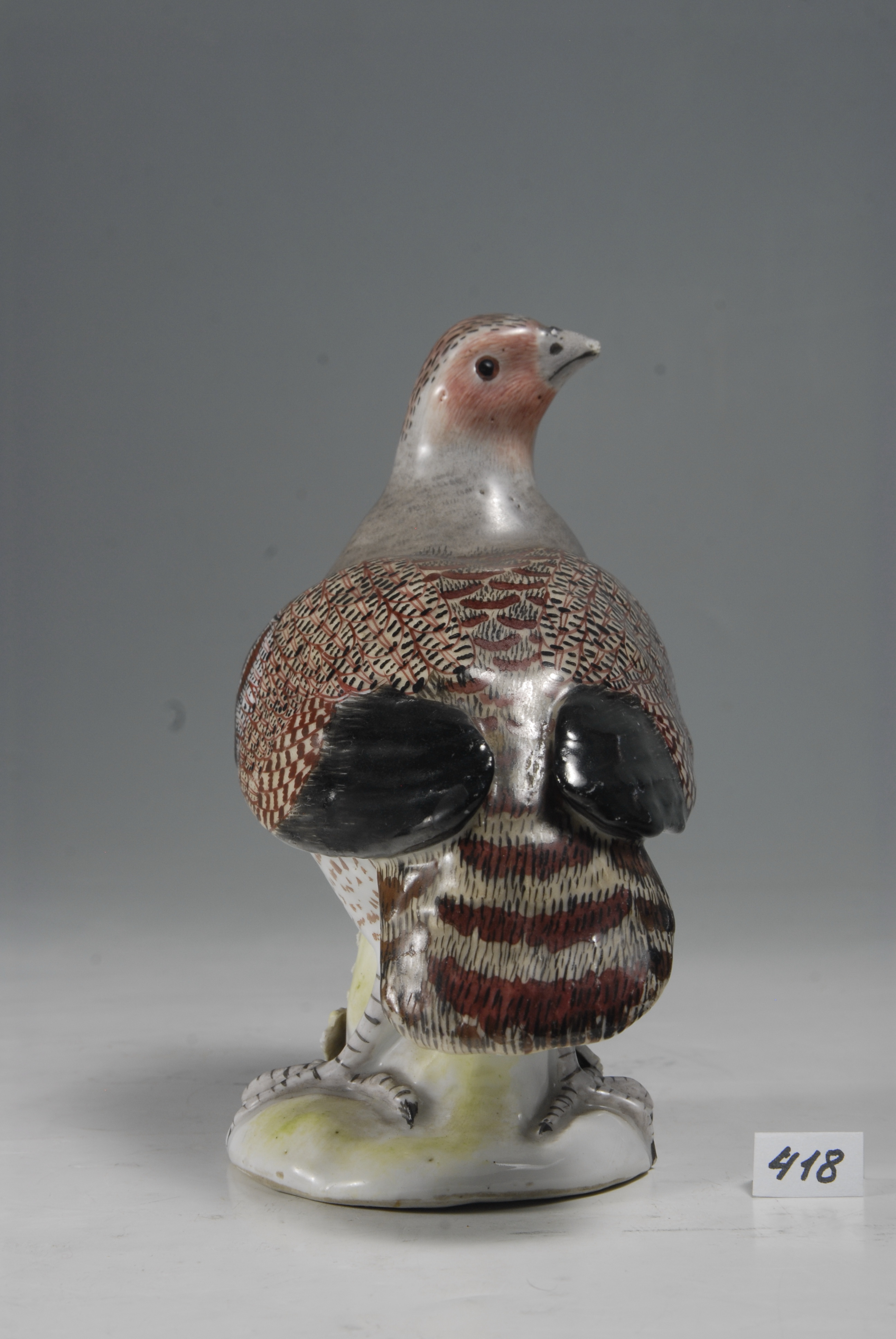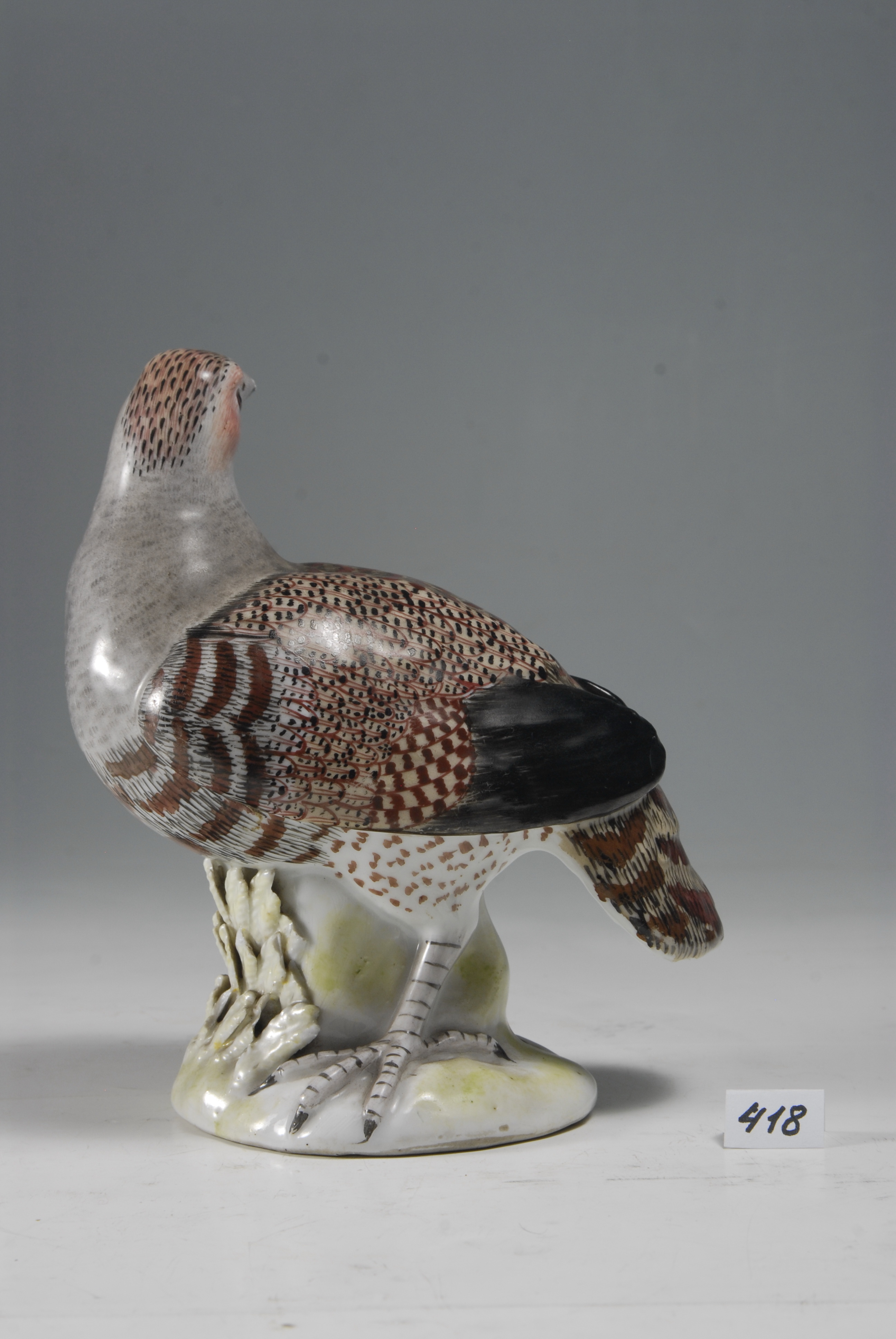 Авторські підписи, клейма: марк немає; в тісті цифри: "53"/Комм.: Куріпка в "натуральний зріст" згадується в "Таксі" Кендлера (Pfeiffer M. A. Ein Beitrag zur Quellengeschichte des europaischen Porzellans (Kandlers "Taxa" 1740 - 1748). Werden und Wirken. Ein Festgruss fur Karl W. Hiersemann, 1924, S267 - 287). Хакенброх ( Meissen and Otcher Continental Porcelain, Faience and Enamel in the Irwin Untermyer Collection (text by Yvonne Hackenbroch), 1956, fig. 12) вважає аналогічну фігуру виконаною у лютому 1741 р. Однак, Альбікер (C. Albiker Die Meissner Porzellantiere im 18. Jahrhundert 1935) та Рюкерт (Meissner Porzellan 1710-1810. Ausstellung im Bayerischen Nationalmuseum Munchen. Katalog bearbeitet von Rainer Ruckert, 1966) вказують, що Кендлер робив куріпок двічі: у лютому 1741 р. великого розміру, а в 1743 р., за участю Едера, дві парні фігури меншого розміру. На основі номеру форми наша модель, як і ермітажна може бути датована 1743 р./Аналогіi: К.С. Бутлер. Мейсенская фарфоровая пластика XVIII века в собрании Эрмитажа. Каталог. 1977, № 316/Історія Атрибуціi: консультація Р.С. Соловейчик (Ермітаж, 1961 р.) - Мейсен, розпис академічного періоду (Куріпка)/Кількість: 1/Модель, форма: модель 1743 р., форма № 501