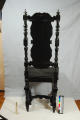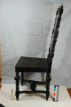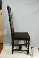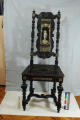 Додаток до назва (лист, ...): Стул чорного дерева, з високою спинкою та дерев'яним сидінням. Спинка сидіння декоровані інкрустацією слоновою кісткою, тема декору - галантні сюжети./Кількість: 1
