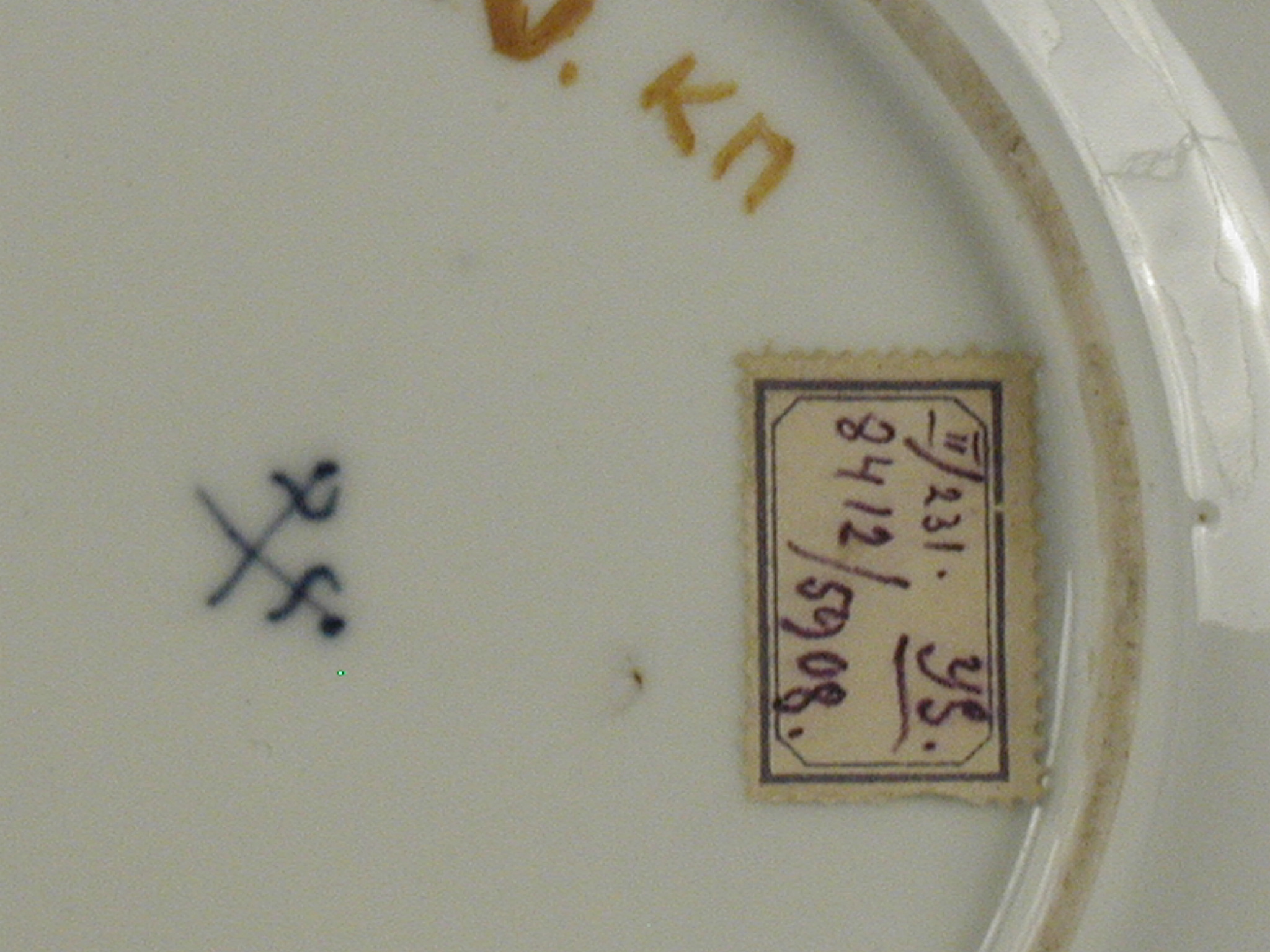 Додаток до назва (лист, ...): з китаїзованим розписом кобальтом та золотом/Авторські підписи, клейма: марка синя підглазурна6 схрещені мечі/Історія Атрибуціi: консультація Р.С. Соловейчик (Ермітаж, 1961 р.) - Мейсен, перша половина 18 ст. (розпис золотом поза заводом)/Кількість: 1