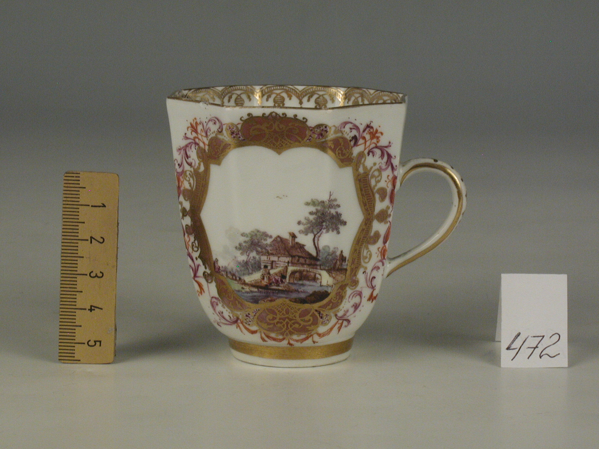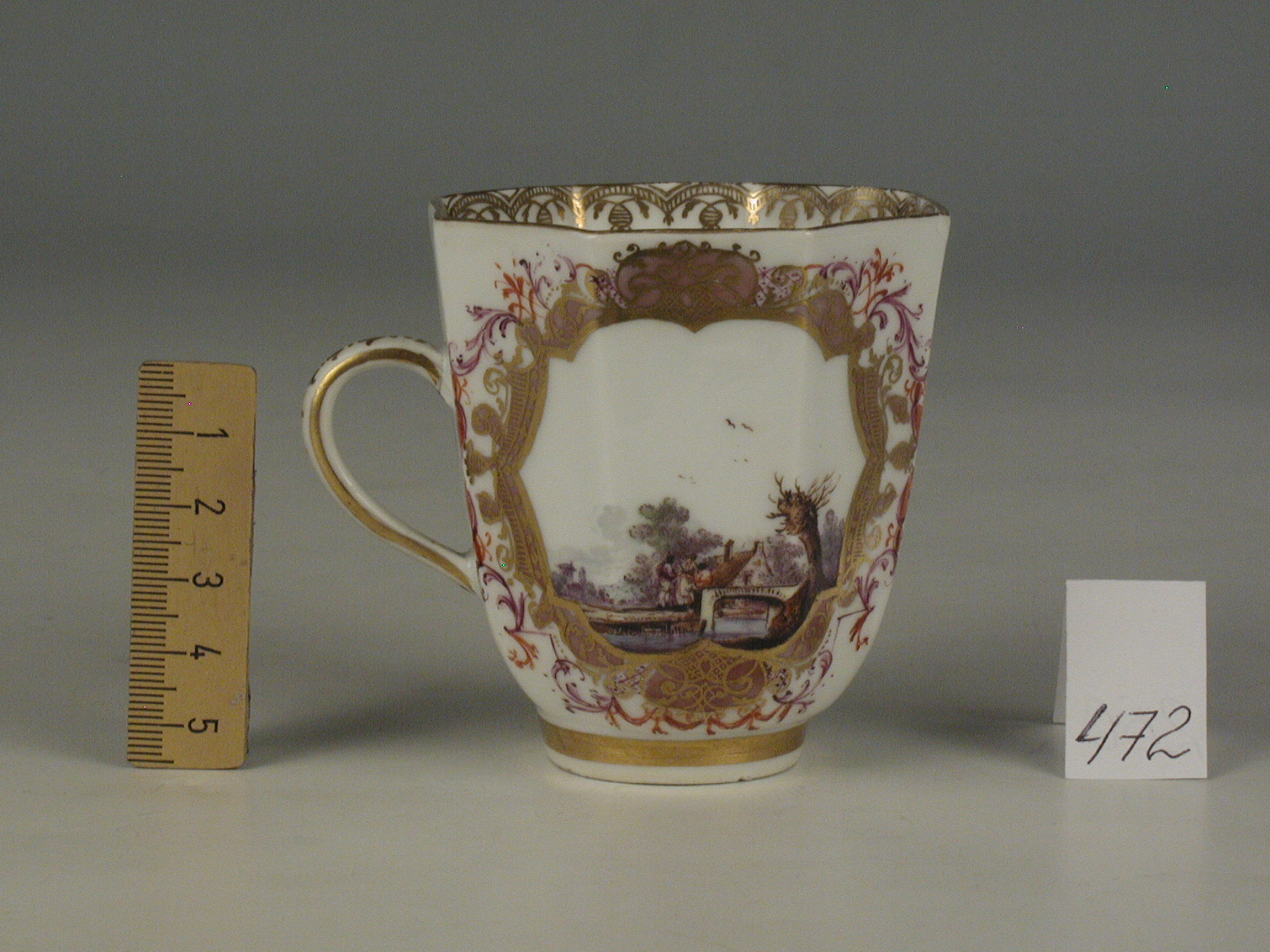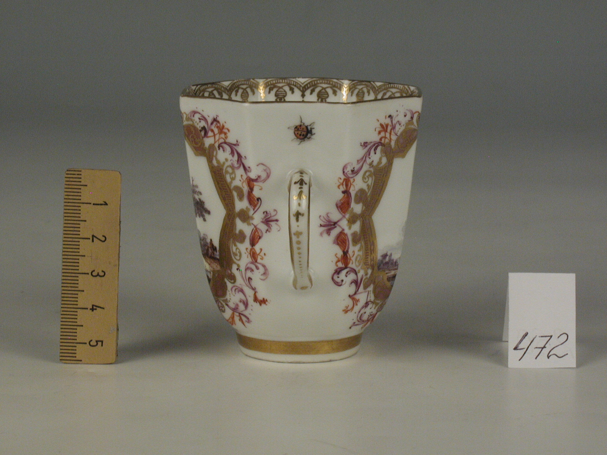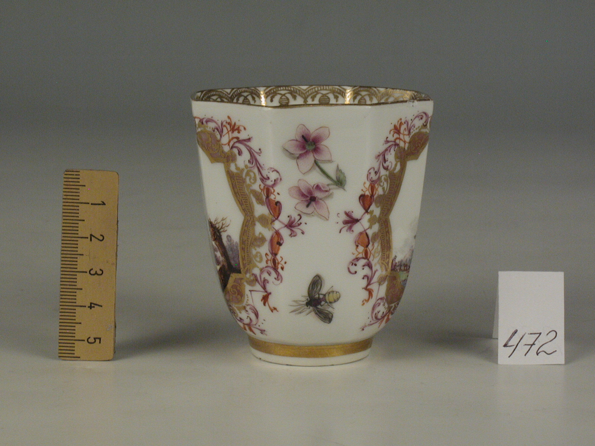 Авторські підписи, клейма: марка синя підглазурна; золотом: 63/Історія Атрибуціi: консультація Р.С. Соловейчик (Ермітаж, 1961 р.) - Мейсен, 1740-і рр./Кількість: 1/Зв'язок з іншими предм. музею: блюдце 253 ПК МХ