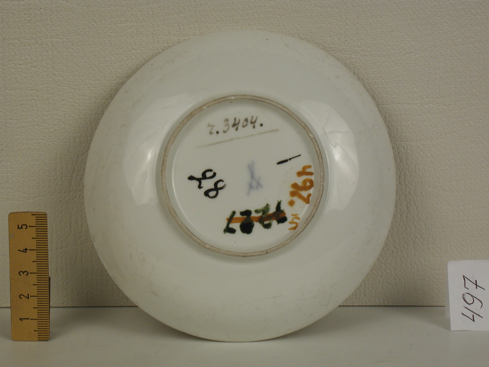 Додаток до назва (лист, ...): з масонськими знаками/Авторські підписи, клейма: марка синя підглазурна/Історія Атрибуціi: консультація Р.С. Соловейчик (Ермітаж, 1961 р.) - Мейсен, сер. 18 ст. (форма рання, розпис середини 18 ст. з масонськими знаками. Бл. 1740 р., можливо Hausmalerei)/Кількість: 1