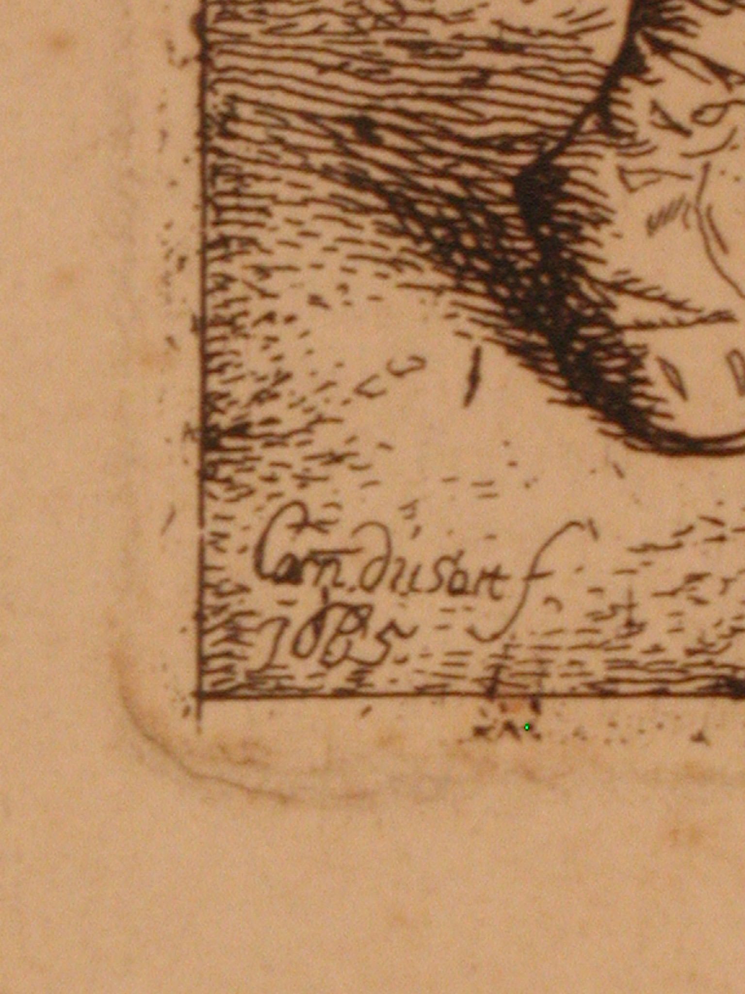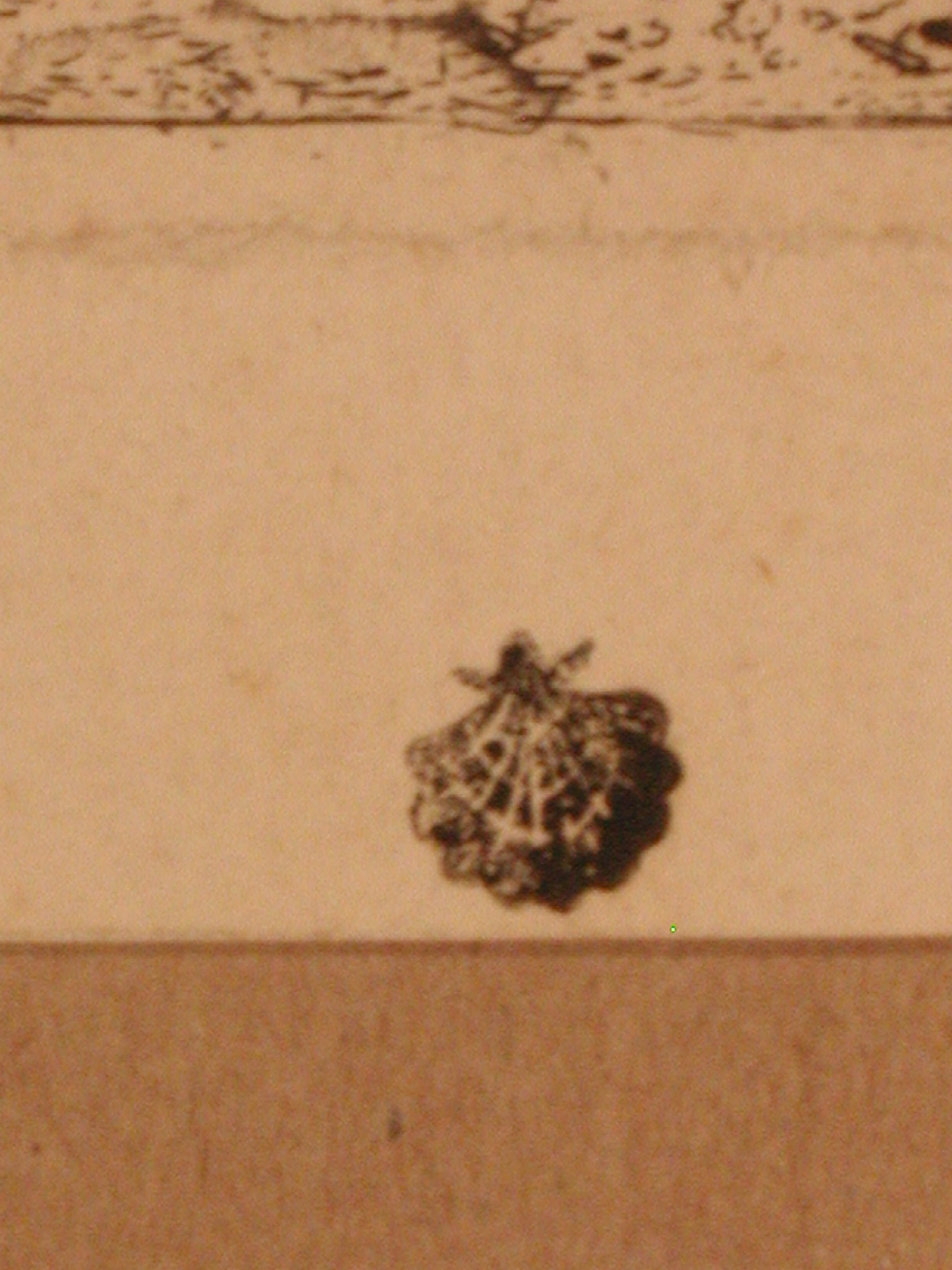 Поля частково зрізані; пожовтіння, забруднення, повсюдні дрібні бурі плями, дрібні надриви по краях. На звороті сліди паперу.,