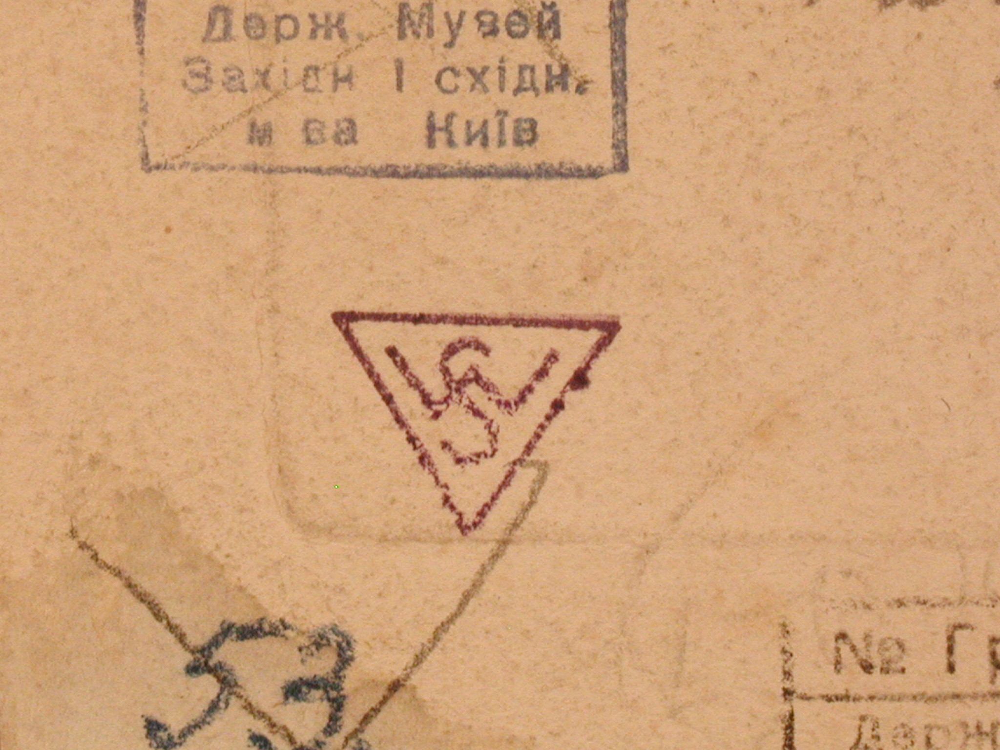 Поля обрізані, забруднення, плями. У верхніх кутах відшарування паперового шару з втратою у лівому куті. На звороті у шести місцях сліди наклеєного паперу.,