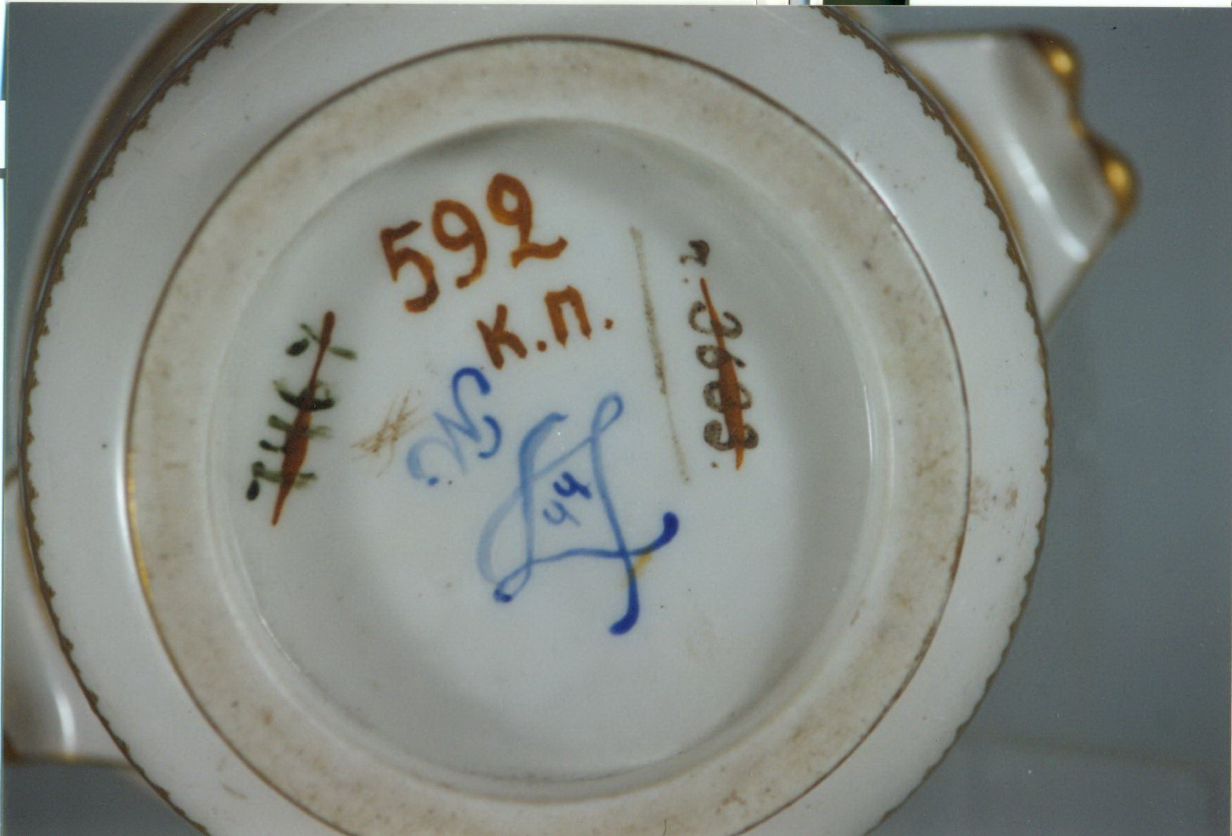 Авторські підписи, клейма: марка/Історія Атрибуціi: консультація Р.С. Соловейчик (Ермітаж, 1961 р.) - фальшиве, під Сер (пляшкова передача, мяка порцеляна)/Кількість: 1/Зв'язок з іншими предм. музею: аналог 591 ПК