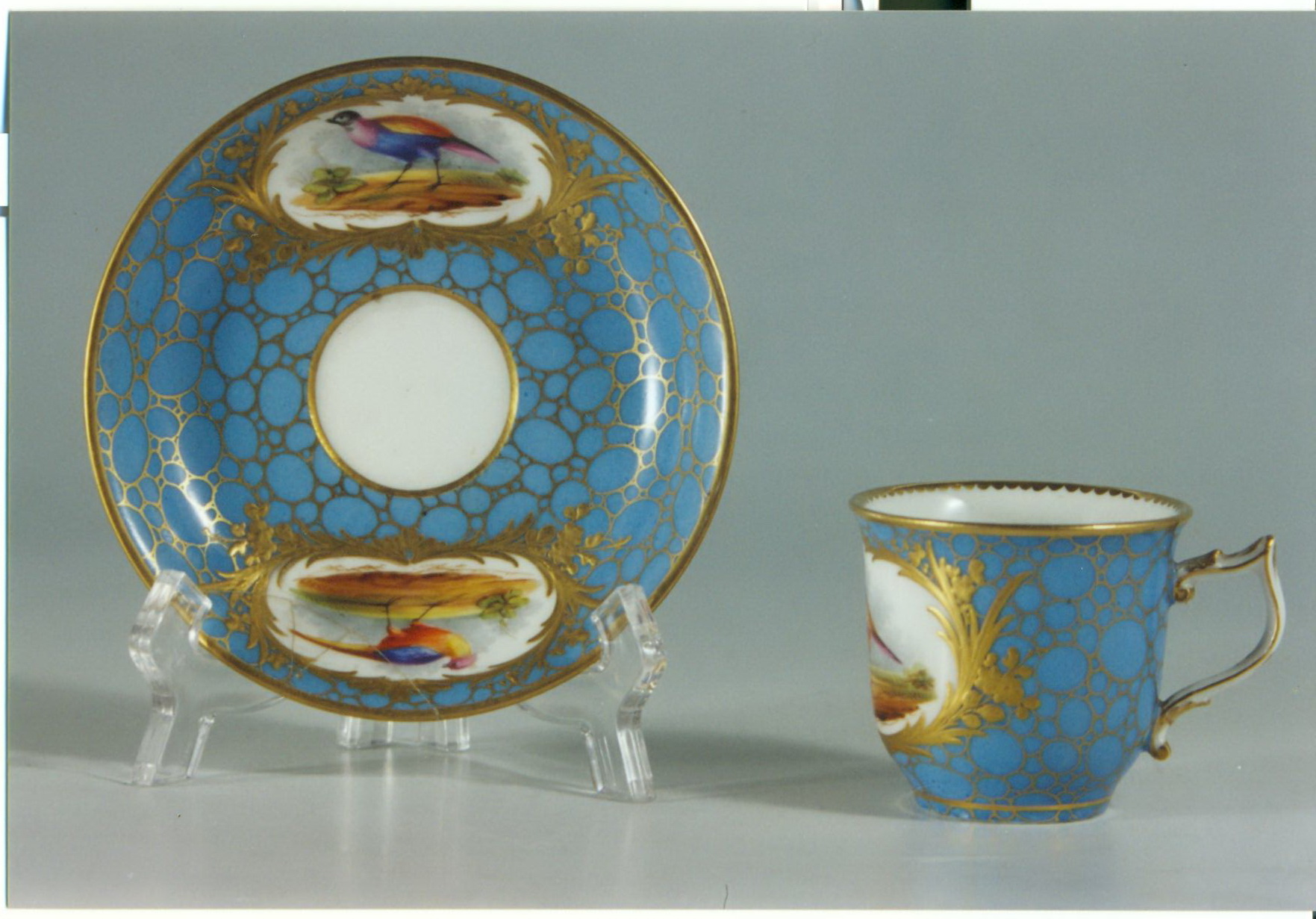 Авторські підписи, клейма: марка золотом з літерою: V/Історія Атрибуціi: консультація Р.С. Соловейчик (Ермітаж, 1961 р.) - фальшива під Севр (тверда порцеляна)/Кількість: 1/Зв'язок з іншими предм. музею: блюдце 598 ПК МХ