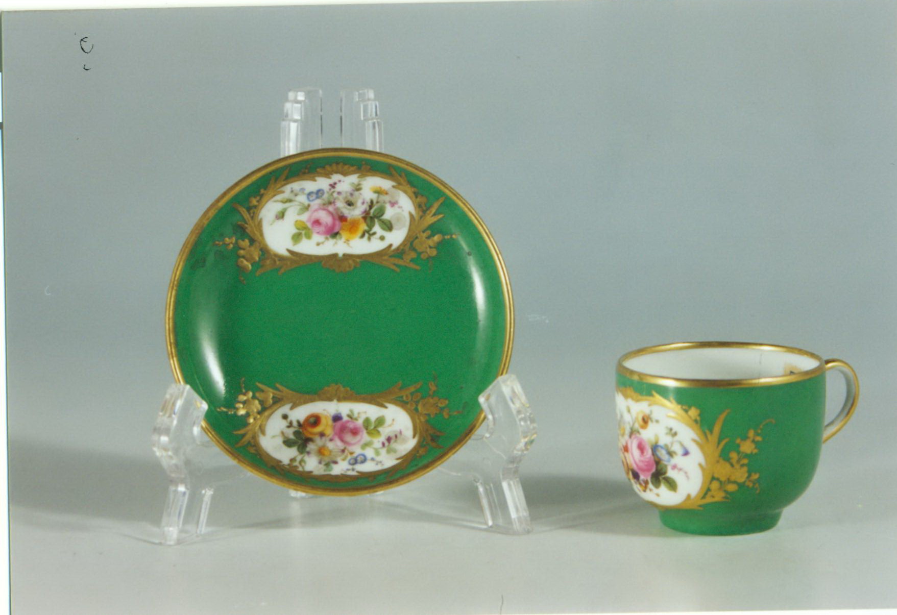 Авторські підписи, клейма: марка червоною фарбою/Історія Атрибуціi: консультація Р.С. Соловейчик (Ермітаж, 1961 р.) - фальшива під Севр/Кількість: 1/Зв'язок з іншими предм. музею: блюдце 602 ПК МХ