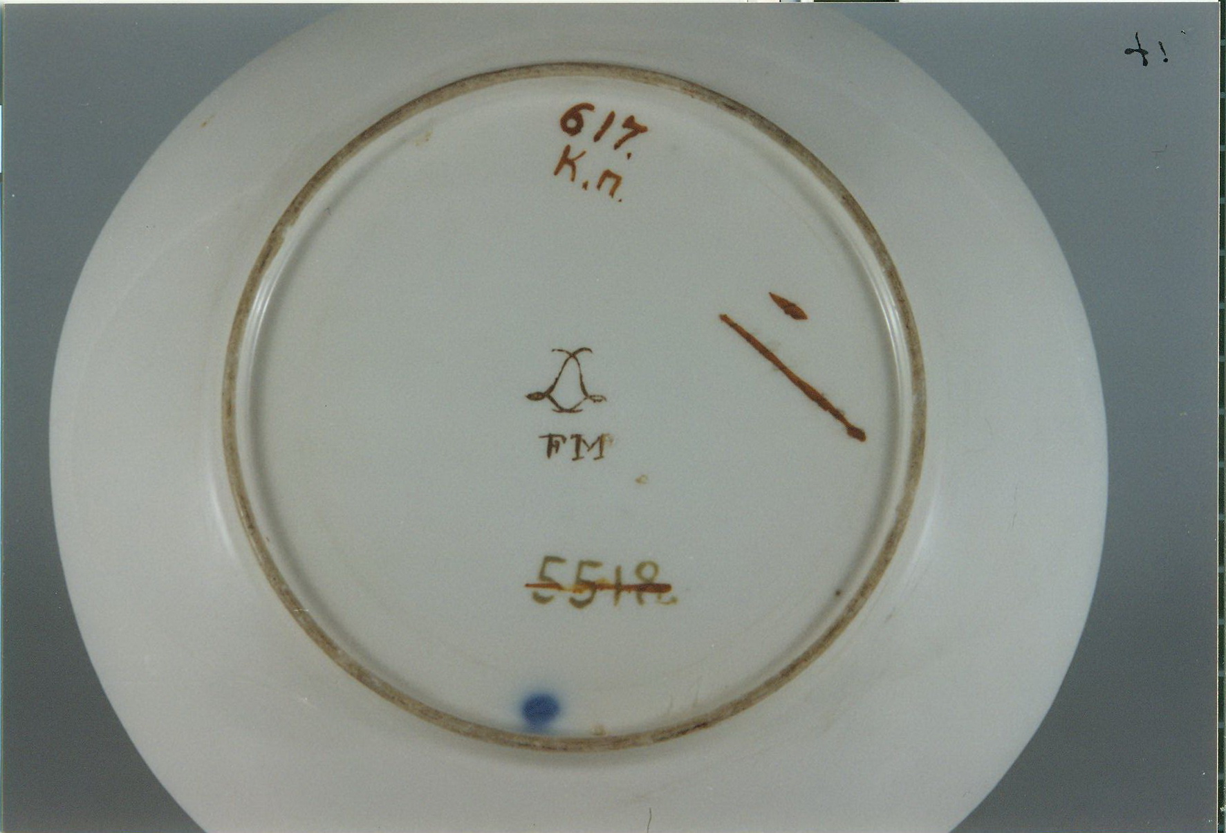 Авторські підписи, клейма: Зі зворотного боку на дні (золотом): марка у вигляді двох переплетених літер L, нижче знак «FM» - знак Франсуа Мірея (Mirey, FranÇois); в тісті знак «DC»./Історія Атрибуціi: консультація Р.С. Соловейчик (Ермітаж, 1961 р.) - Севр, 1791 - 1793 (лоток круглий)/Кількість: 1/Старі документи прийому: за списком № 209/Опис: Компотьєр круглий на низькій кільцевій ніжці. Розпис золотом та платиною на чорному тлі: фігури китайців в архітектурному пейзажі.