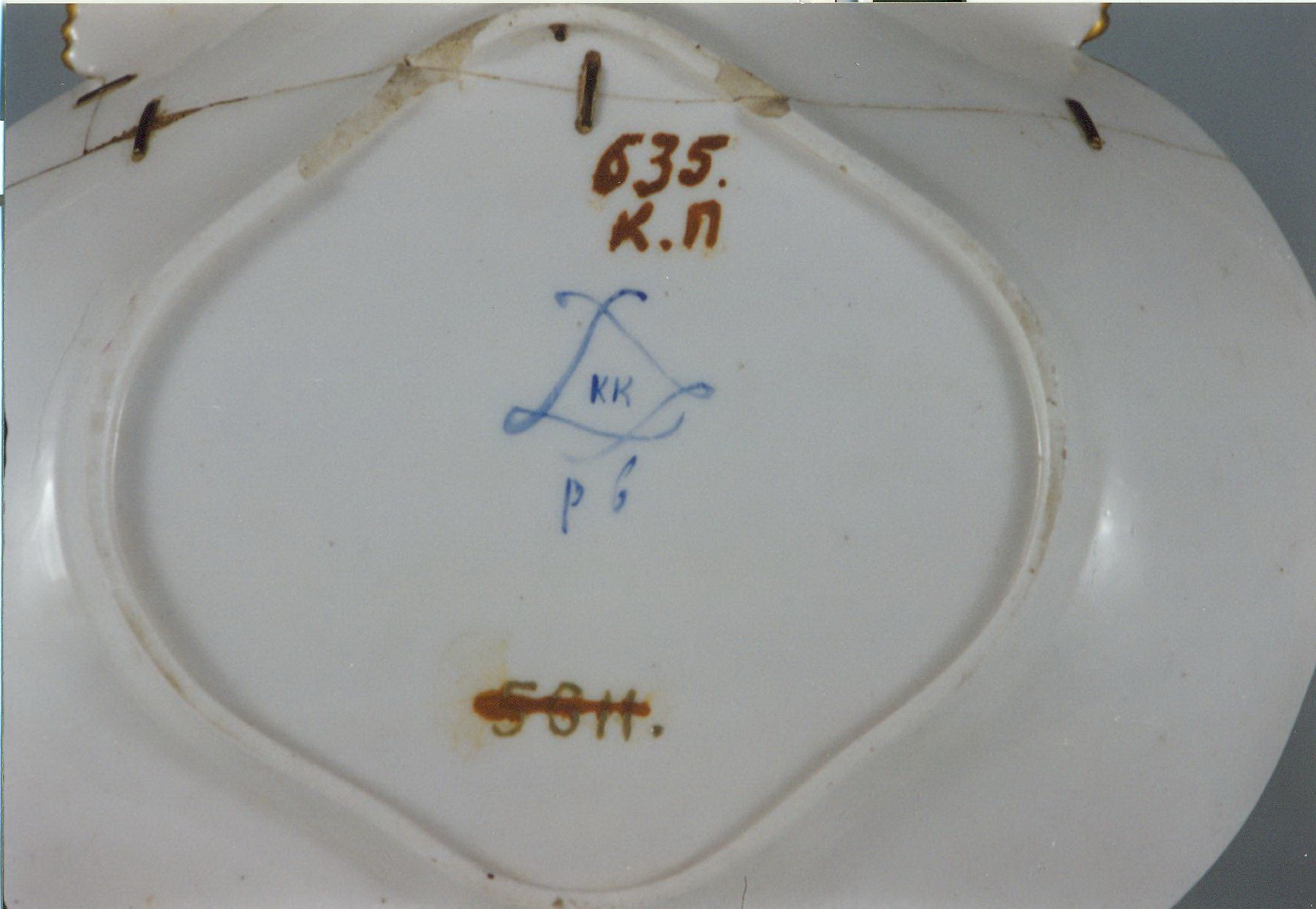 Історія Атрибуціi: консультація Р.С. Соловейчик (Ермітаж, 1961 р.) - Севр, 1788 р. (мяка порцеляна)/Кількість: 1/Старі документи прийому: за списком № 170, серія 11820 - 22