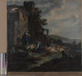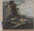 Кількість: 1/Опис: Багатофігурна композиція на тлі пейзажу з руїнами ліворуч. Ліворуч – вершниця на ослі, перед нею – уклінна жінка з козою. Праворуч – вівці. На першому плані у центрі собака.