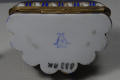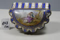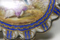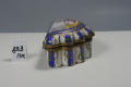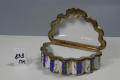 Додаток до назва (лист, ...): у формі мушлі з кришкою на шарнірі, в металевій оправі./Авторські підписи, клейма: Марка синя надглазурна: вензель з двох схрещених літер "L" з літерою "В" в центрі./Кількість: 1/Опис: Табакерка у формі мушлі з кришкою на шарнірі, в металевій оправі; опуклі корпус і кришка розписані синьою підглазурною смугою з золотими гірляндами з листя; на кришці у напівкруглому медальйоні поліхромний розпис: пасторальна сцена із зображенням пейзажу з кавалером і дамою.