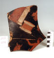 Додаток до назва (лист, ...): Форма фрагмента - неправильний чотирикутник. Внизу на ньому зображена голова і частина тіла оголеної людини з білою паличкою, частина голови коня і частина вази. В центрі - велика тумба з білими виступаючими краями, ліворуч від неї нижня частина тіла людини, яка спирається на білу чотиригранну колону. Праворуч частина руки, що спирається на тканину./Ком. до розмірів: Коментар до розмірів: одиниця виміру не зазначена./Кількість: 1/Старі документи прийому: У чинній інвентарній книзі старі документи прийому не зазначені.