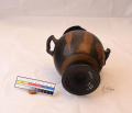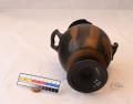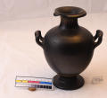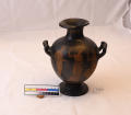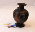 Додаток до назва (лист, ...): В лицьовій частині амфори зображена дівчина та оголений юнак у довгому одязі. Дівчина, повернувши праворуч, голову тримає у правій піднятій руці довге стебло. З одного боку від неї стоїть юнак, що дивиться на неї. Другий юнак, повернувшись до неї спиною, сидить на плащі, перекинутому через його ліву ногу. Нижня частина корпуса охоплює широка світла смуга, заштрихована тонкими лініями, які закінчуються вгорі великими цятками. Навколо горла орнамент з вузького довгого листя, яке спускається вниз. На вузькій стороні відігнутих вінець орнамент з меандрів, які кругляться./Ком. до розмірів: Коментар до розмірів: одиниця виміру не зазначена./Кількість: 1/Старі документи прийому: У чинній інвентарній книзі старі документи прийому не зазначені.
