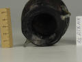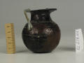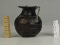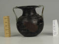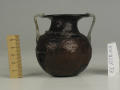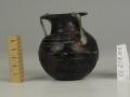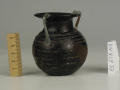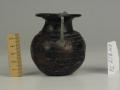 Додаток до назва (лист, ...): Сферичний корпус переходить в коротку широку шийку, відігнутою у великі пласкі вінця. Дві тонкі ручки зеленуватого скла зігнуті під ктуом на рівні вінець та приварені до їх потовщеного бортика. Нижні кінці ручок прикріплені до верхньої частини корпуса. Дно пласке. По дну та корпусу вазочки йде спірально рельєфний рубчик. У нижній частині корпуса його рядки більш рідкі, ніж у верхній./Кількість: 1/Старі документи прийому: У чинній інвентарній книзі старі документи прийому не зазначені.