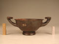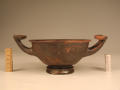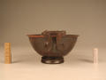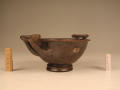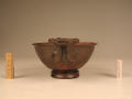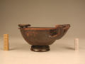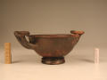 Додаток до назва (лист, ...): У верхній частині ніжка прикрашена рельєфним виступом. Тулово глибоке. За допомогою рельєфної лінії всередині переходить у високий бортик. Вінця злегка відігнуті назовні. Ручки вигнуті, тонкі, припідняті вгору. Вся поверхня нерівномірно вкрита тьмяним лаком. На дні (з зовнішнього і внутрішнього боку) червоні плями від обпіку./Кількість: 1/Опис: У верхній частині ніжка прикрашена рельєфним виступом. Тулово глибоке. За допомогою рельєфної лінії всередині переходить у високий бортик. Вінця злегка відігнуті назовні. Ручки вигнуті, тонкі, припідняті вгору. Вся поверхня нерівномірно вкрита тьмяним лаком. На дні (з зовнішнього і внутрішнього боку) червоні плями від обпіку.