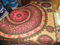 Это сузани (ой палак-это название,оно отражает колличество кругов в основном поле вышивки,сузани-это переводится "вышито иглой",т.е. вышивка).Просхождение-Ташкент.Полный зашив поля ,вышито швом "босма"(разновидность глади вприкреп),контуры узора я не вижу на фото,но обычно вышивают стебельчетым швом.Орнаментация и композиция традиционна для периода с1910-1970гг.Более точную датировку дать не могу(не вижу ткань-основу,нити и качество вышивки). Орнаментика на всех трех вышивках центрична:ой-(луна) является основой композиции ,на всех присутствует доисламский S-образный символ змеи(дракона)-охраняющий дом,очаг,устрашающий врагов и злые силы ,помыслы; символ стилизован под растительный побег,что характер