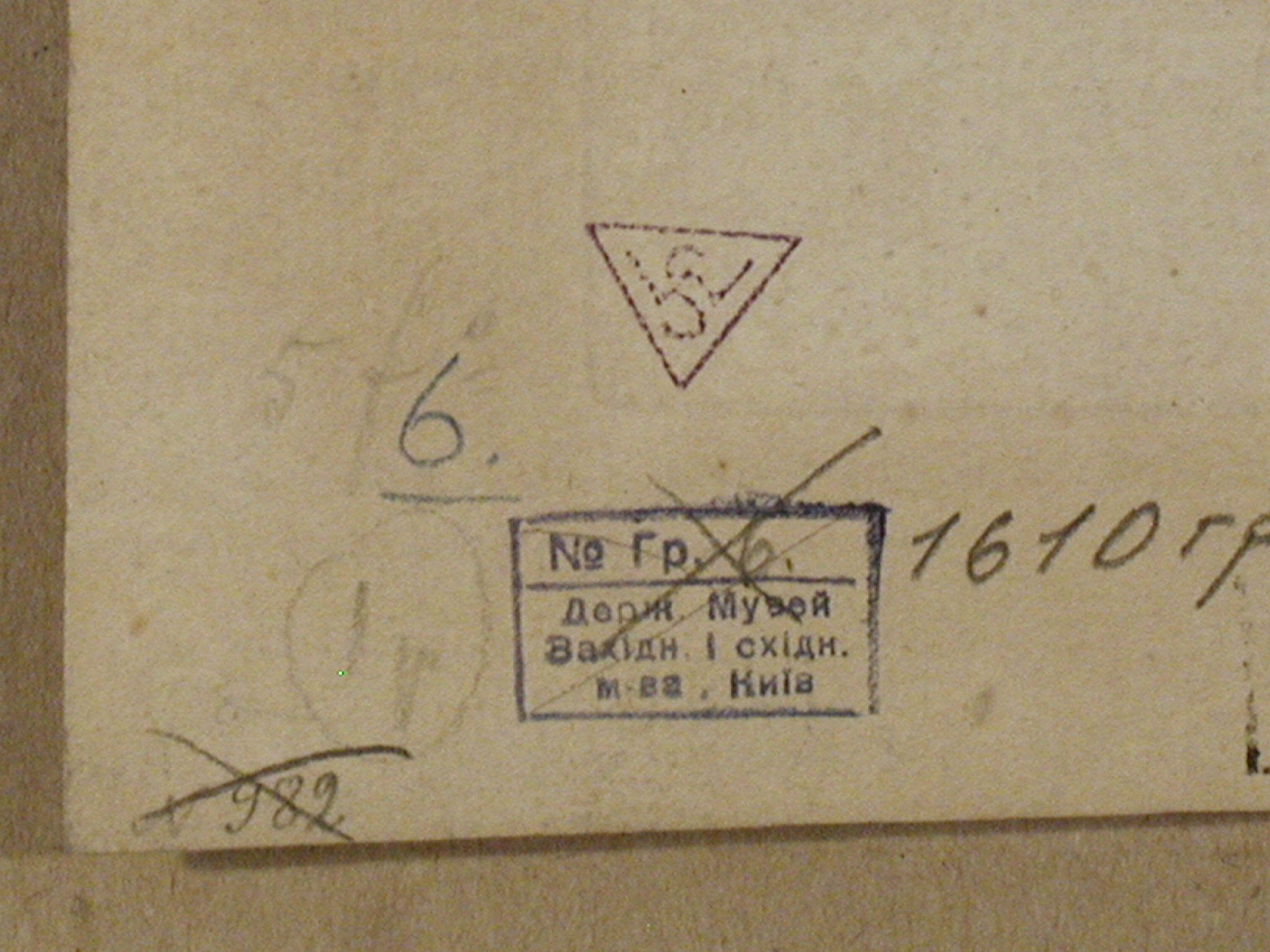Закладка “Атрибуція” - Змiн. назва: П'яниця надто серйозний./Змiн. Iншi написи, штампи, печатки, етикетки, наклейки: На звороті і лівому нижньому куті печатка В.О.Щавинського і № 982.