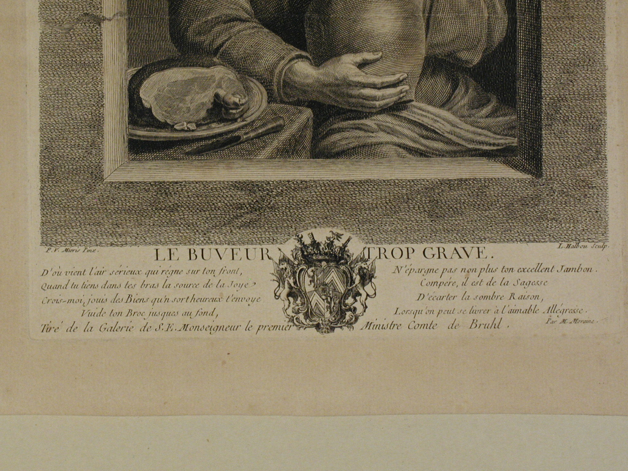 Комм.: Переклад віршу: Звідки прийшов вигляд серйозний, що панує на твоєму обличчі,/ Коли тримаєш у руках джерело Радощів./ Повір мені, насолоджуйся добром, яке щасливий вихід тобі надсилає./ Допий свій жбан до дна,/ Не береги тим більше твою шинку. / Врахуй, Це - Мудрість/ Відсунути похмурий розум,/ Коли можливо ввіритися приємним радощам./Информацiя об оригiнале: Під зображенням - Le buveur trop Grave. Два чотиривірша M. Moraine, герб з короною і напис - Tiré de la Galerie de S.E. Monseigneur le premier Ministre Compte le Bruhl. Під зображенням зліва підпис:. F.v. Mieris pinx и праворуч J. Halbou sculp./Кількість: 1/Внеш. особ. (в раме...): паспарту 395х360