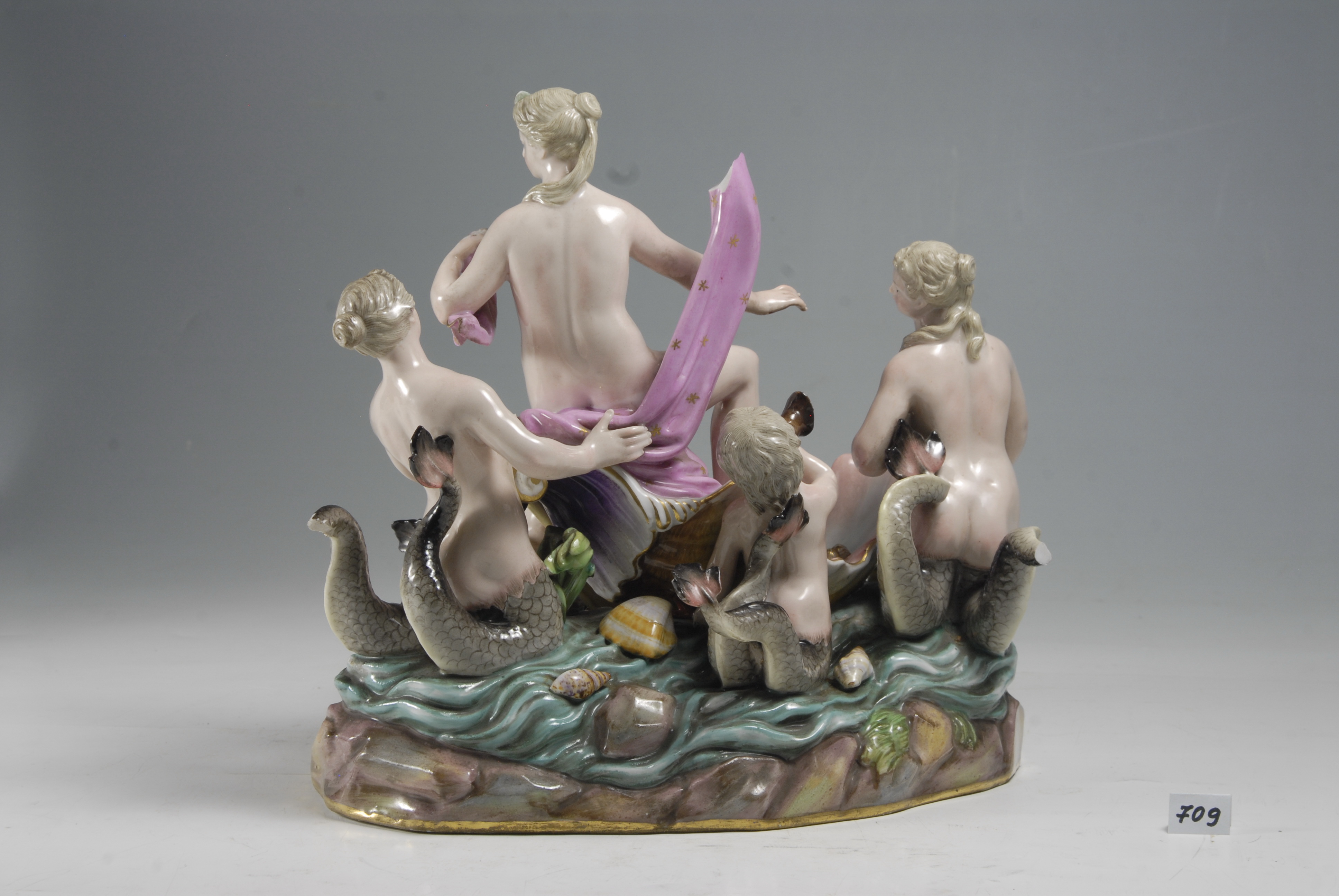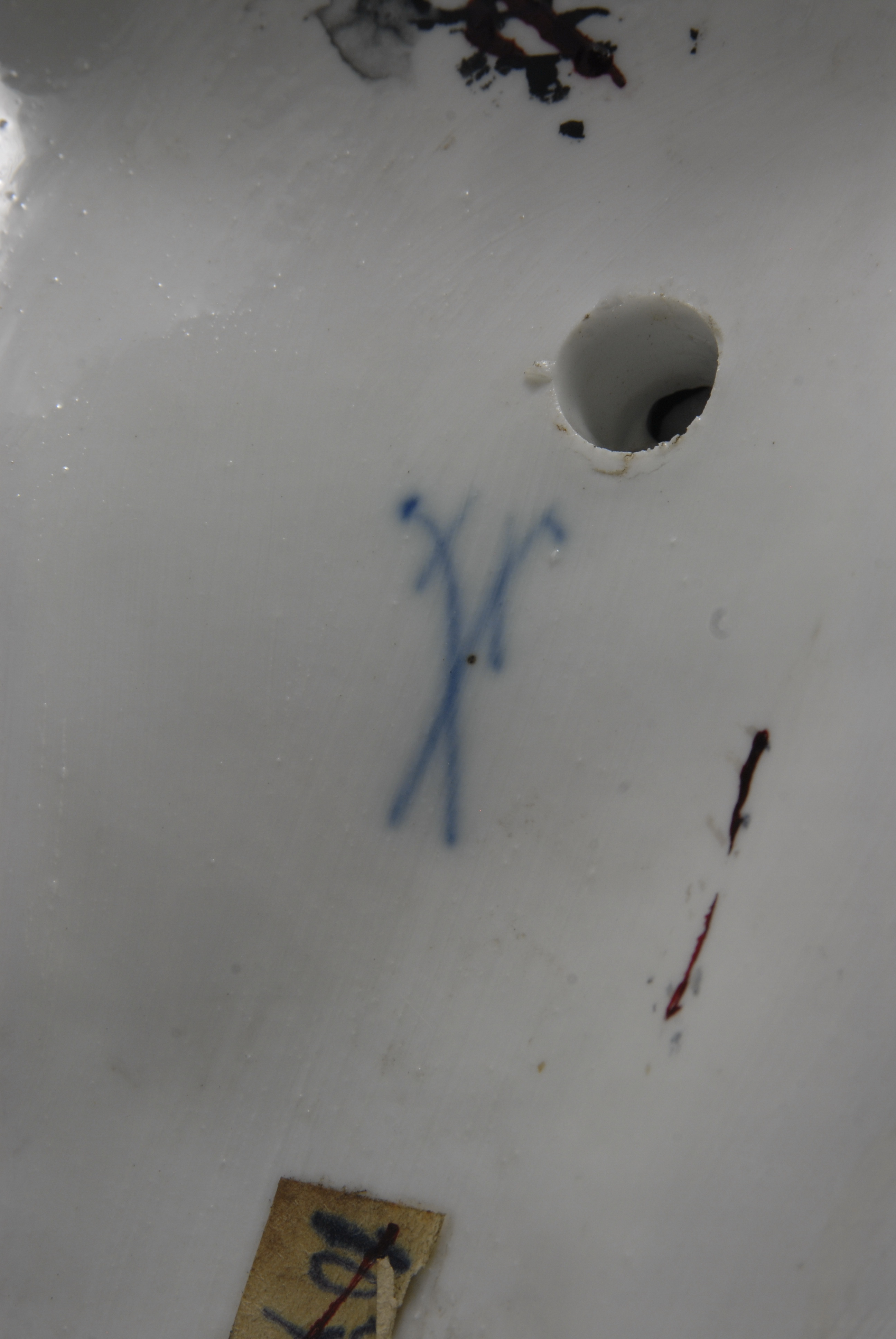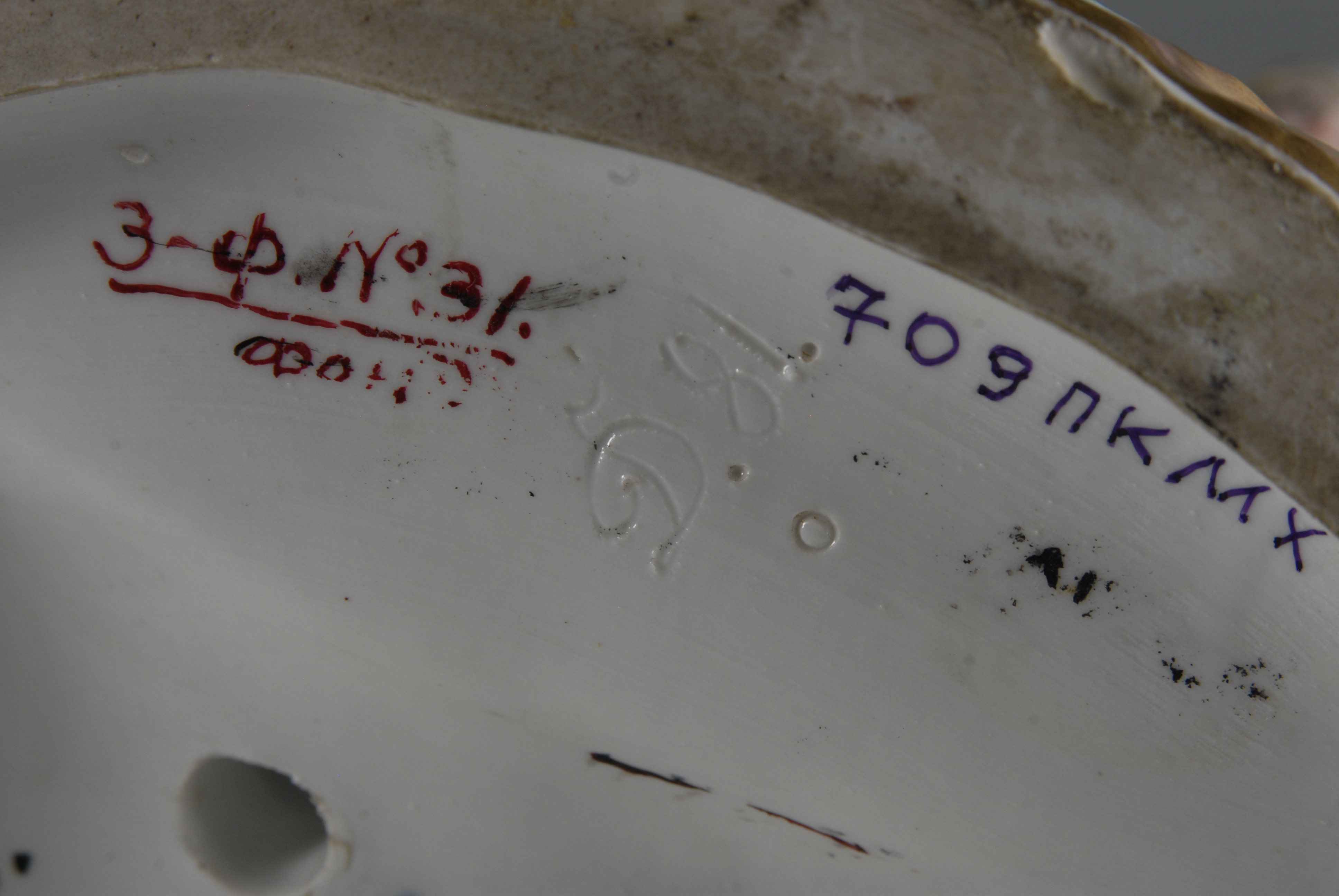 Авторські підписи, клейма: мара синя підглазурна: схрещені мечі/Історія Атрибуціi: консультація Р.С. Соловейчик (Ермітаж, 1961 р.) - Мейсен, 19 ст. (Тріумф Амфітриди)/Кількість: 1/Старі документи прийому: за актом БВ № 1