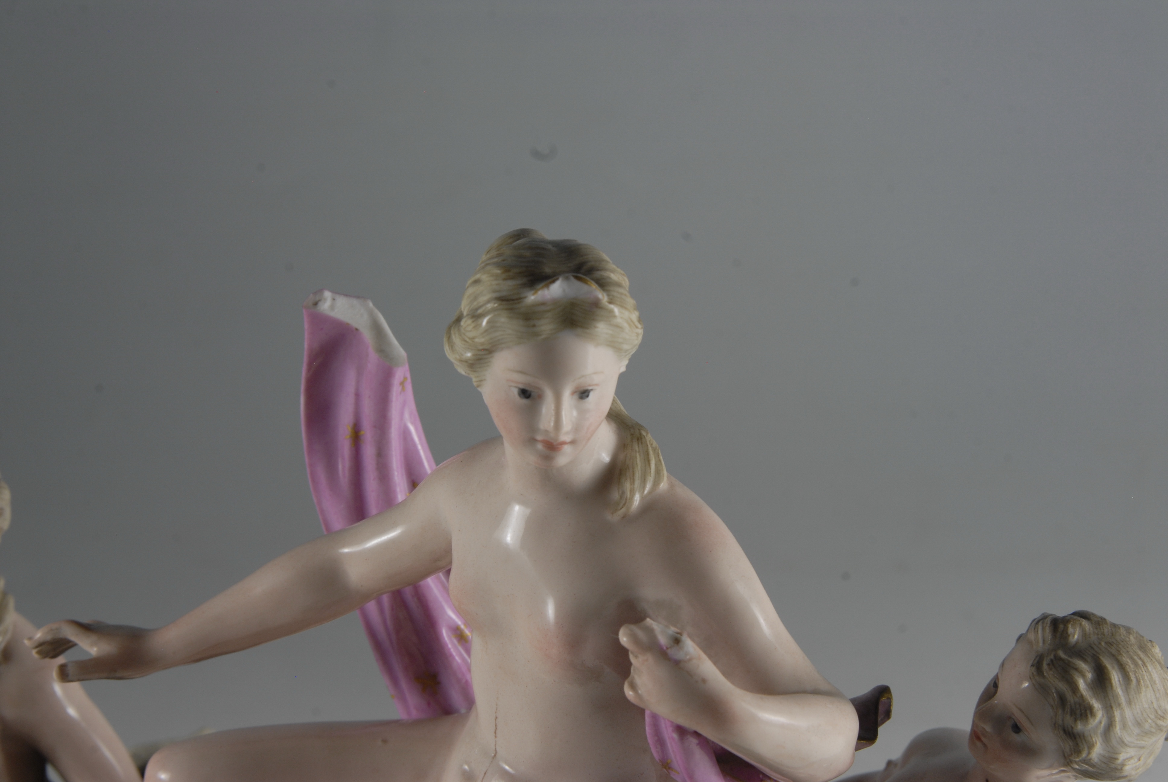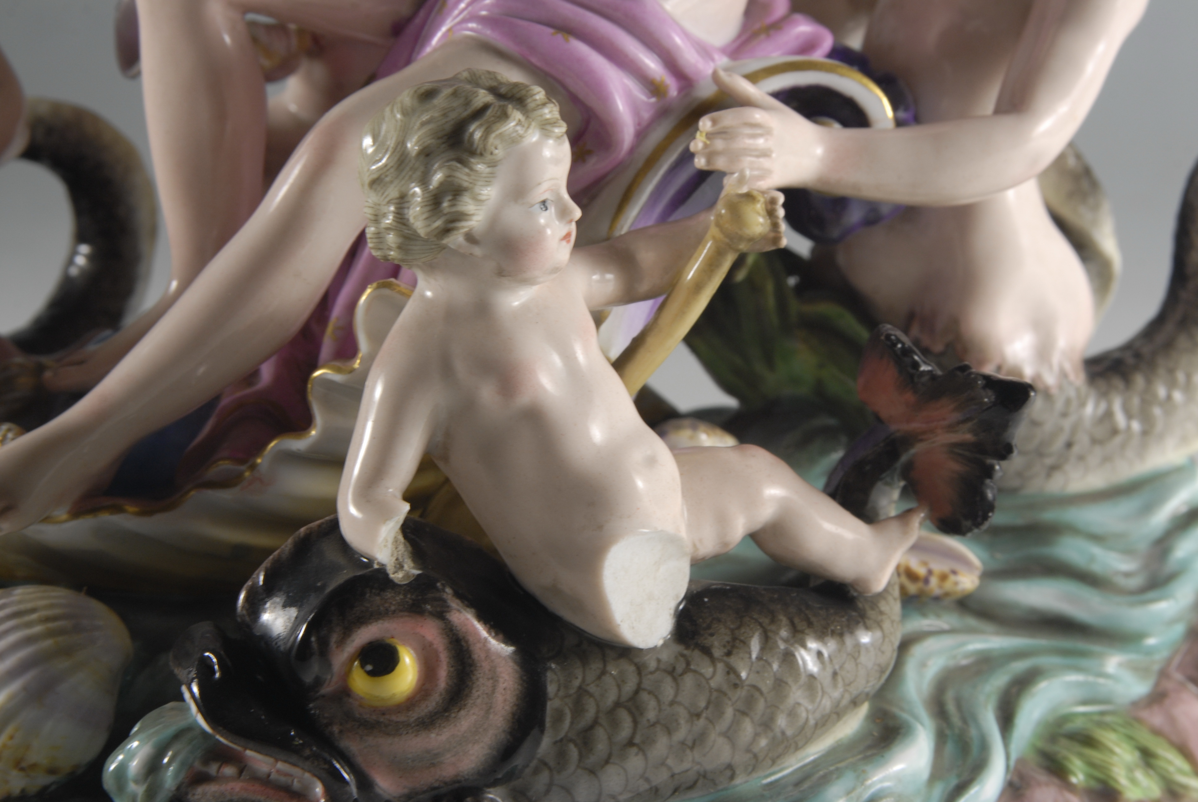 у двох нереїд утрачено по одному з плавників. У хлопчика, який сидить на рибі, утрачено праву ногу до стегна та праву руку до ліктя. У шарфа Венери втрачено кінчик.,
