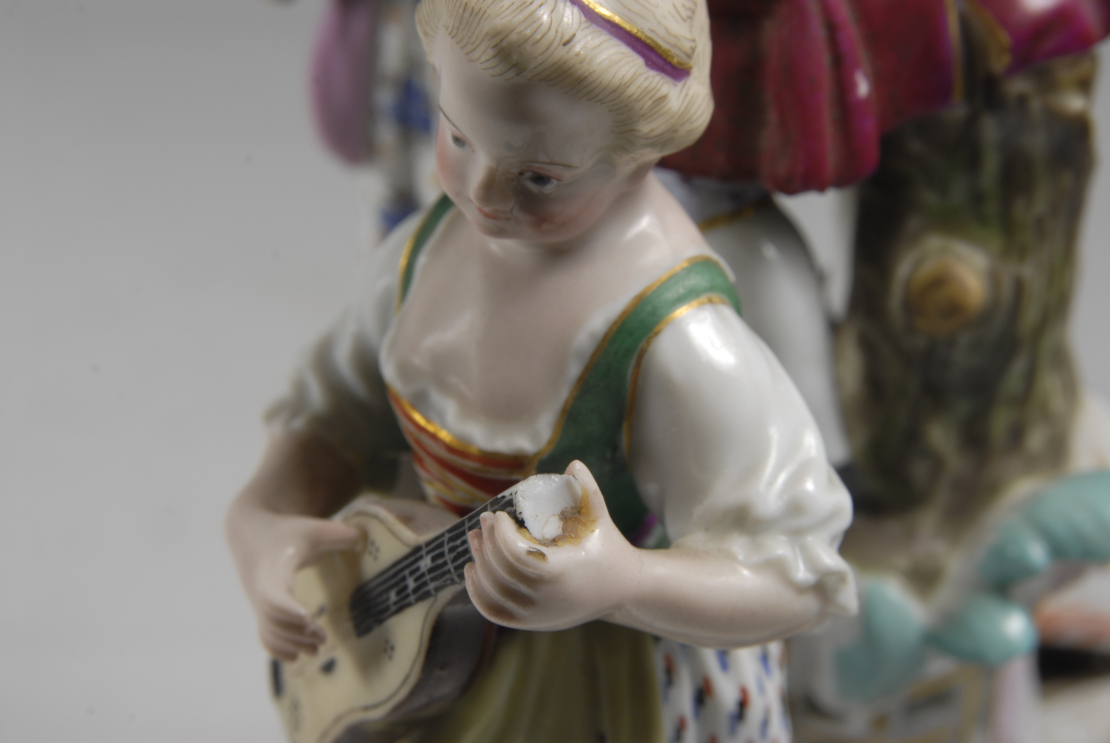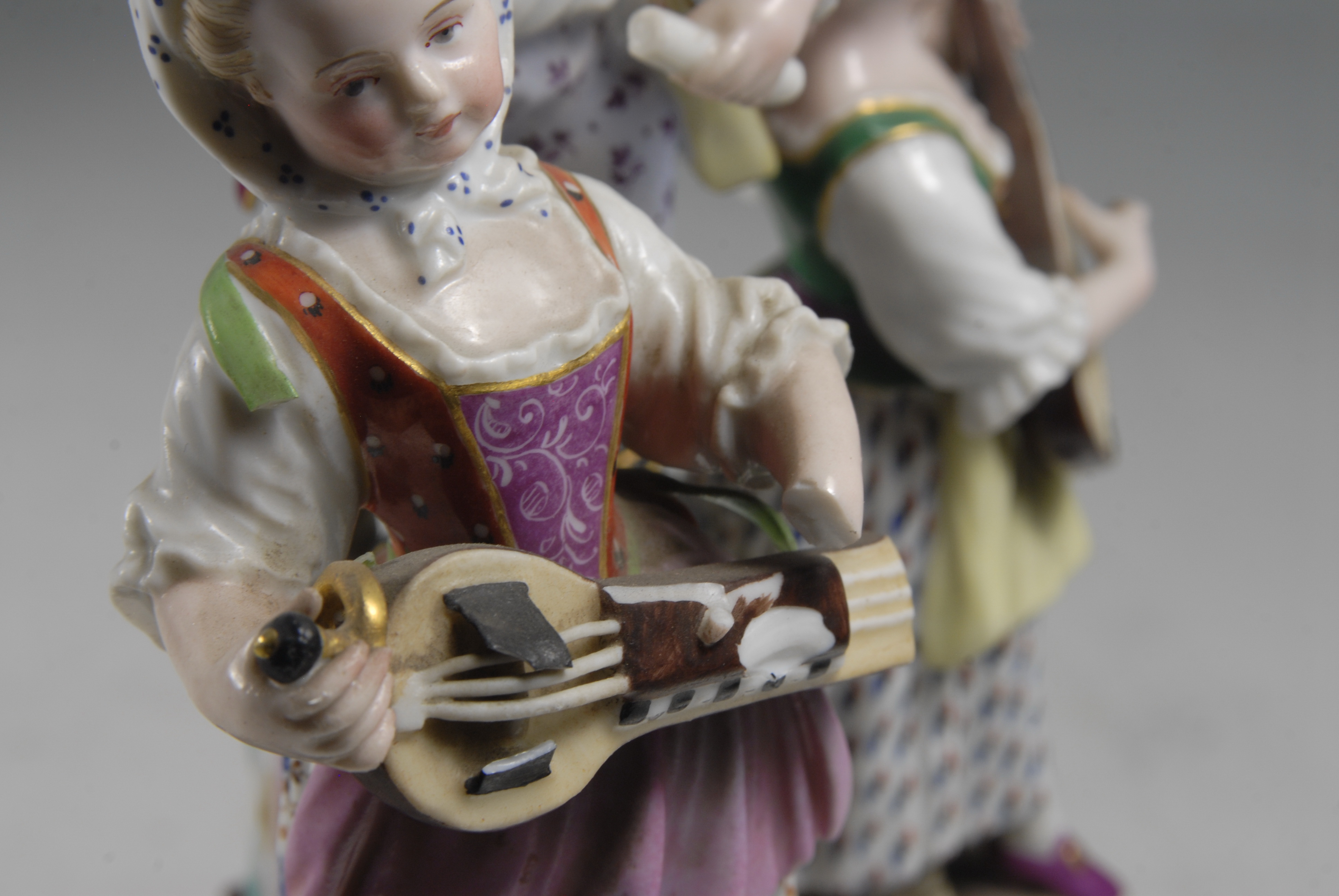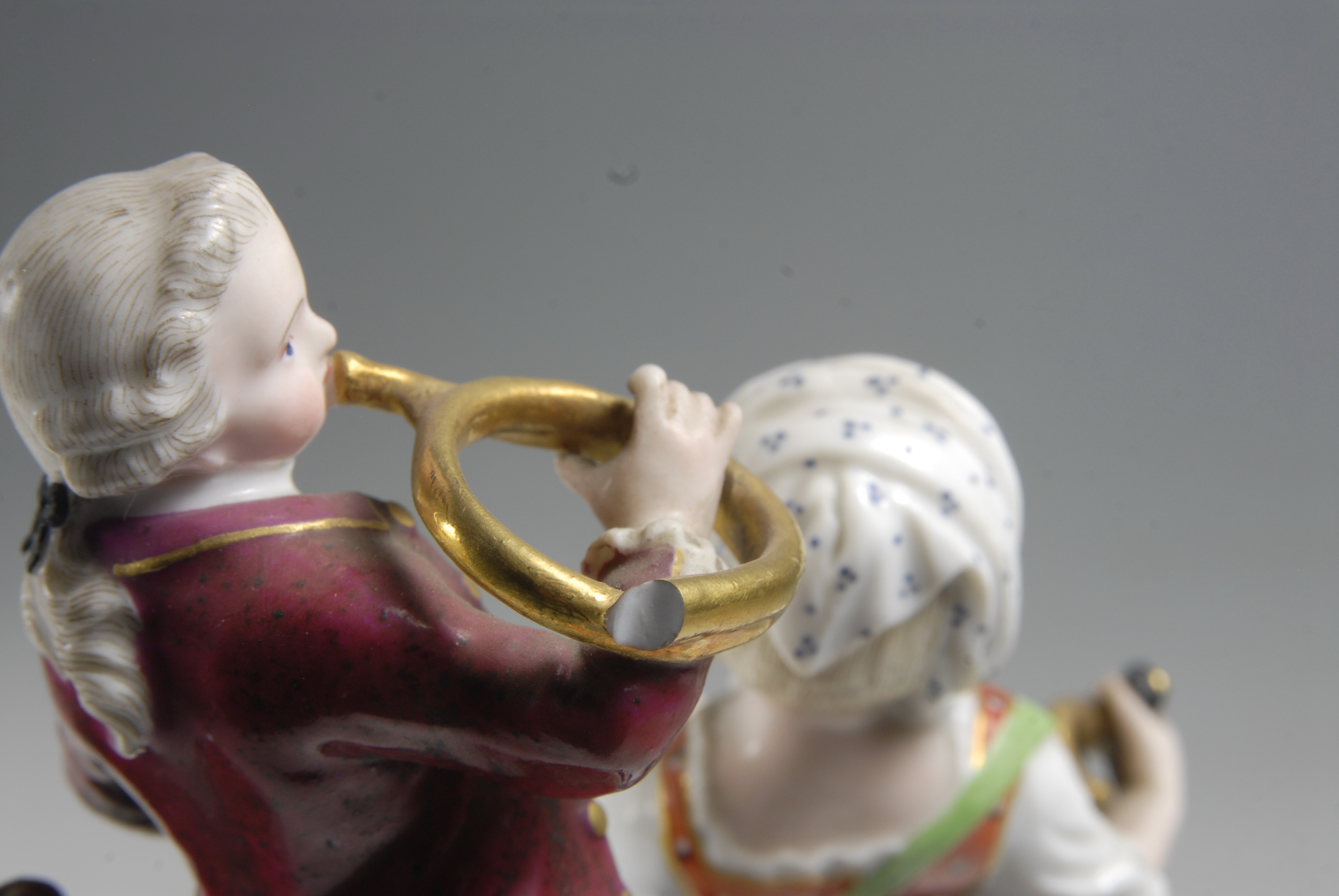 Авторські підписи, клейма: марка синя підглазурна: схрещені мечі ... Золотом літери "Dr", в тісті цифри "58", "74", "В 60"/Історія Атрибуціi: консультація Р.С. Соловейчик (Ермітаж, 1961 р.) - Мейсен, сер 19 ст. за моделлю Марколіні ("Музыцирующие дети")/Кількість: 1/Старі документи прийому: акт БВ № 1