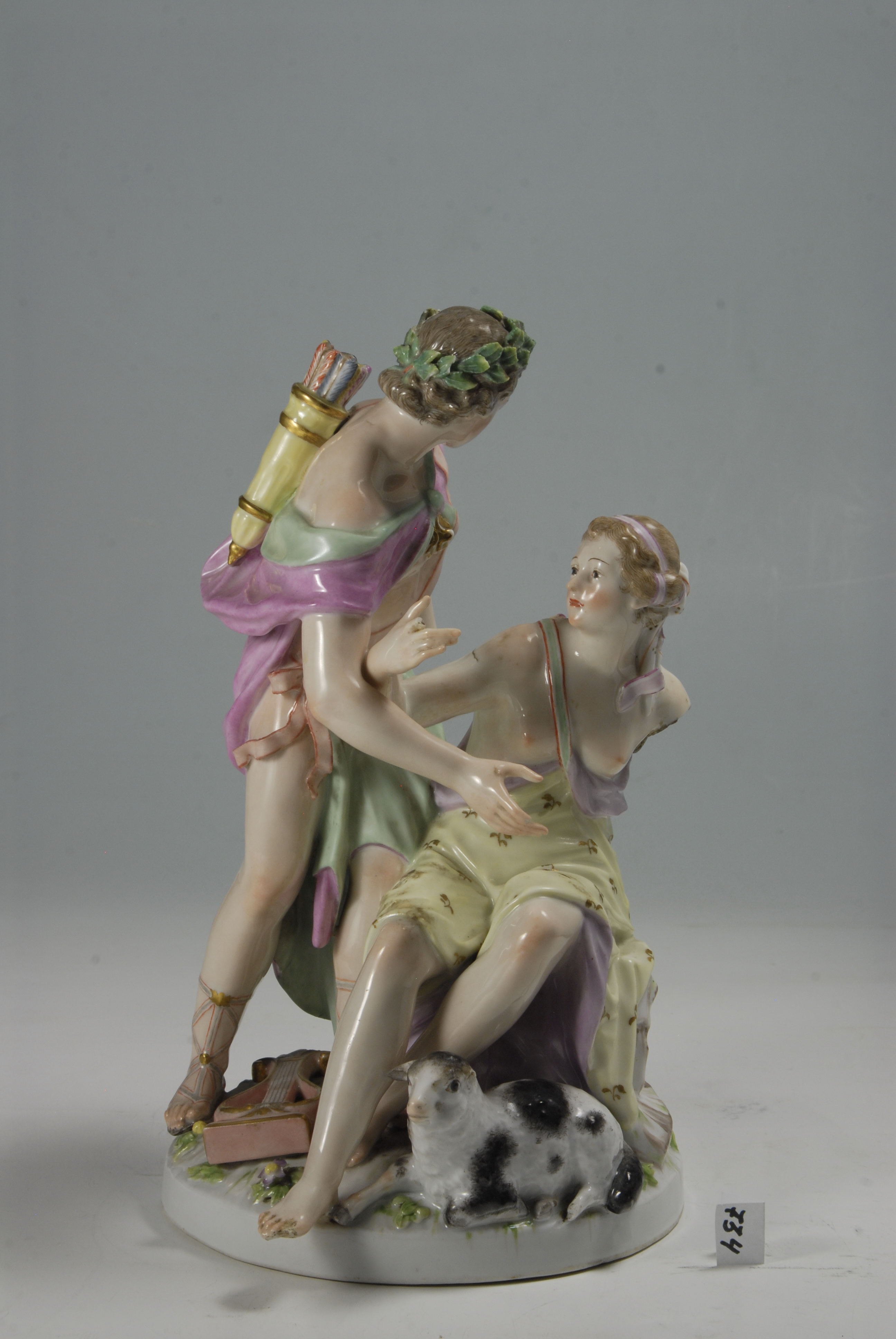Закладка “Атрибуція” - Наим. предмета, издания: Аполон з пастушкою./Змiн. розміри: висота 25,2/Змiн. Написи, клейма, марки: марка синя підглазурна: скіпетр. В тісті врізані цифри: 43/Змiн.опис: Аполон з пастушкою. Пастушка сидить на виступі підніжжя; на ній блідо-жовте плаття, розписане золотими квіточками, на бузковій підкладці. Поряд, схилившись над нею, Аполон в зеленому лавровому вінку; на ньому ліловий плащ на світло-зеленій підкладці, через плече перекинуто блідо-рожеву стрічку, завязану на стегні пишним бантом, за спиною - сагайдак зі стрілами. З заду на підніжжі стоїть амур з луком у лівій руці; на ньому коричневий плащ на блакитній підкладці. Біля ніг пастушки - вівця; біля ніг Аполона - кіфара. Підніжжя кругле з ліпленими квітами та листям./Змiн. час створення: 1770 - 1780-і рр.місце створення, школа: Королівська порцелянова мануфактураИзм. техника: надглазурний поліхромний розпис