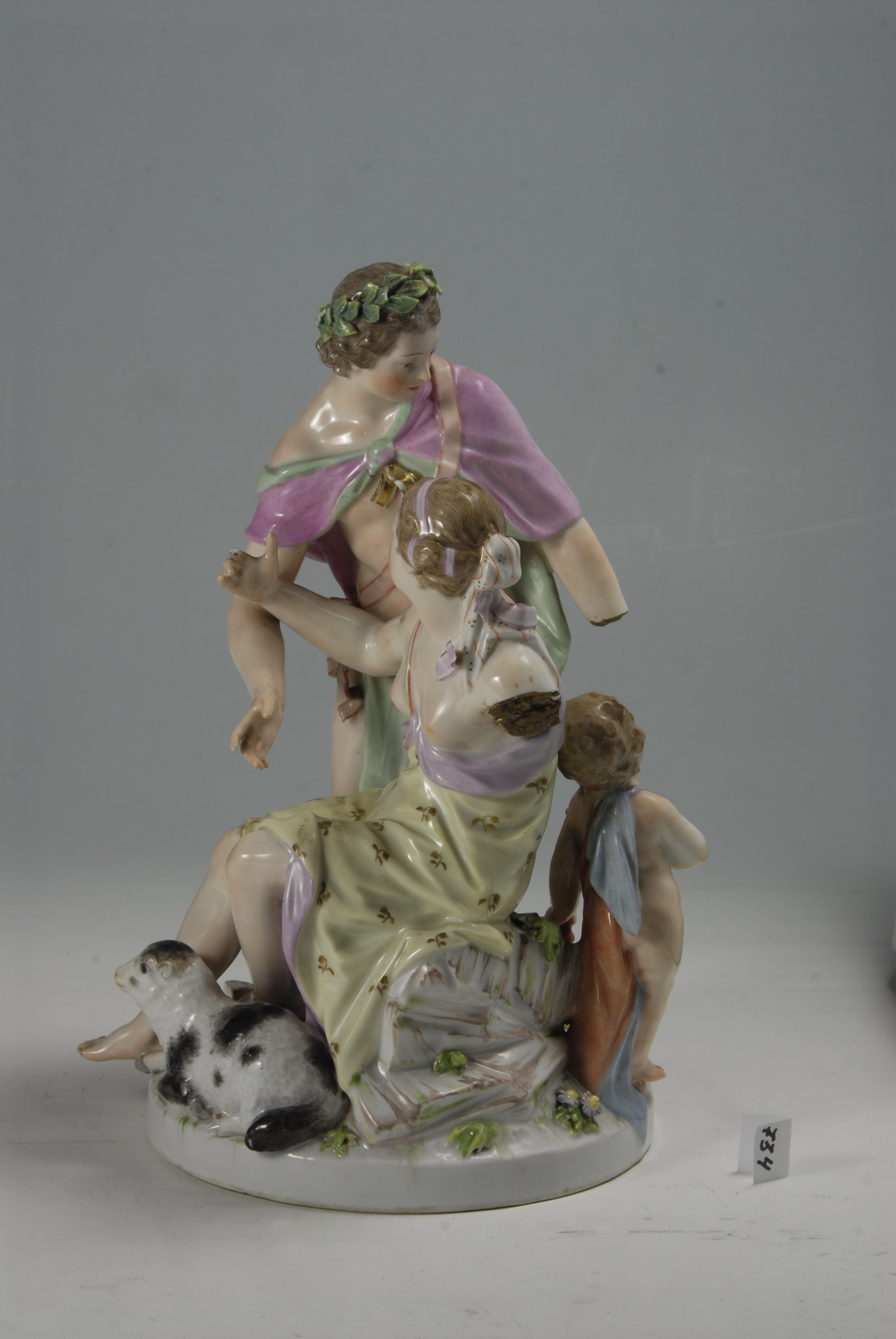 Утрачено: у жіночої фігури - ліву руку до плеча, пальці на правій руці та нозі, частину стрічки, яка спускається з волосся на груди; у Аполлона - ліву руку вище кисті, кінчик вказівного пальця на правій руці та кінчики листя на лавровому вінку; у Амура - предмет в правій руці (стріла) та частину лука з вказівним пальцем на правій руці; у вівці - ліве вухо та частина лапи. На підніжжі збоку відколи на квіточках та значний відкол черепка.,