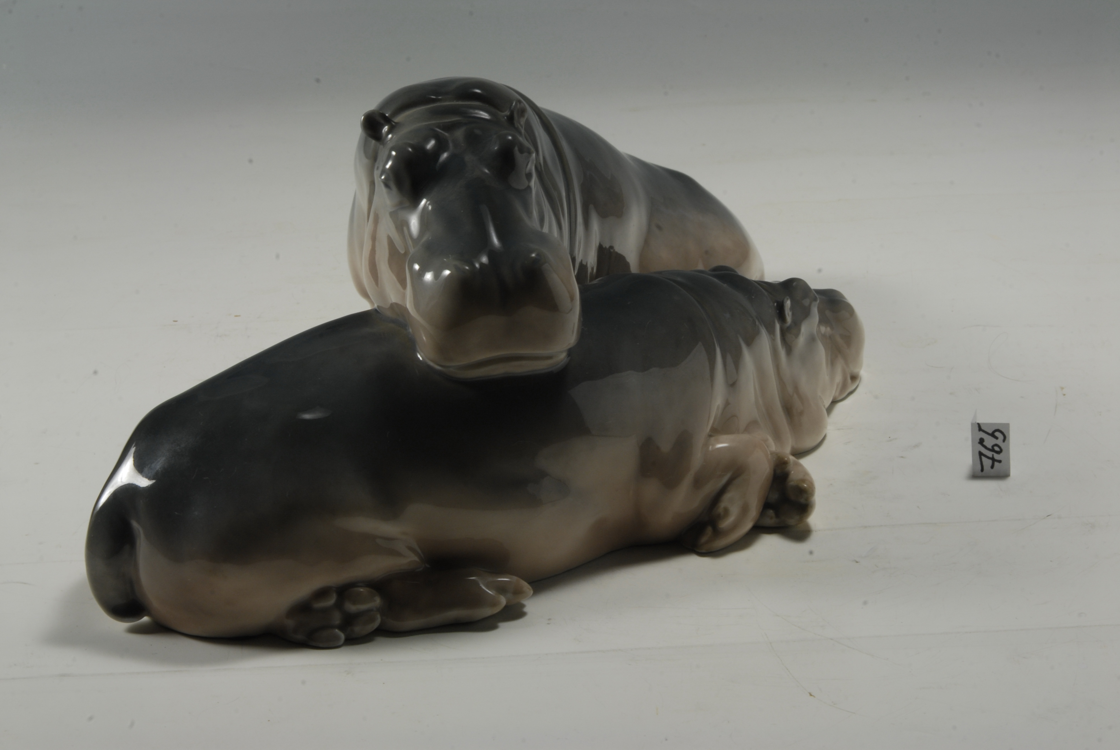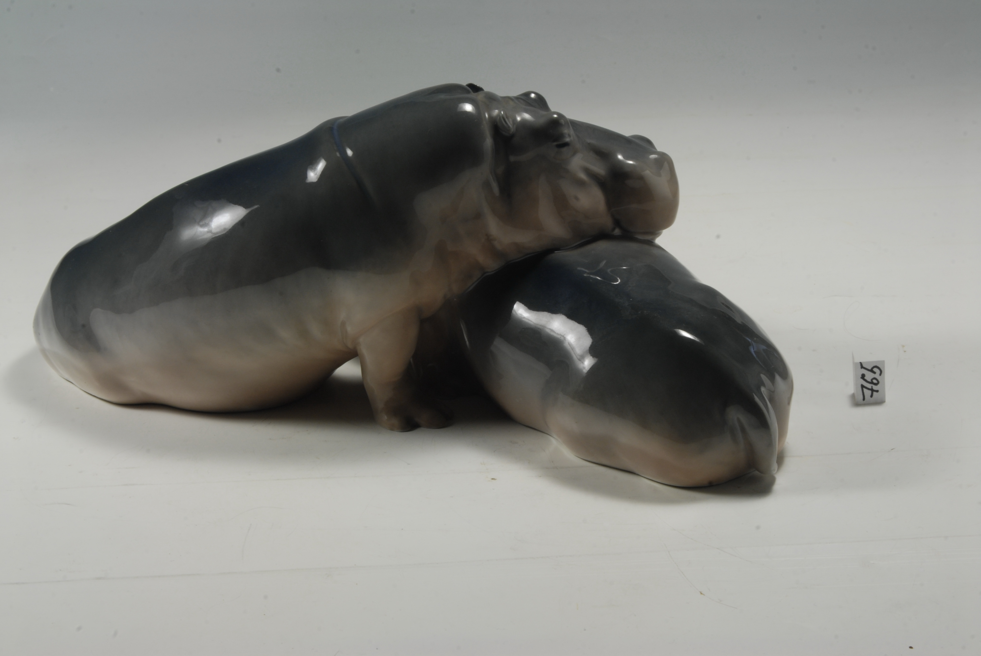 Закладка “Атрибуція” - Змiн.опис: Два бегемоти, один з яких лежить, а другий, піднявшись на передні лапи, поклав голову йому на спину. Окраска спинок сіра,черев - рожева./Змiн. час створення: кінець XIX - початок XX ст.місце створення, школа: Королівська порцелянова мануфактура