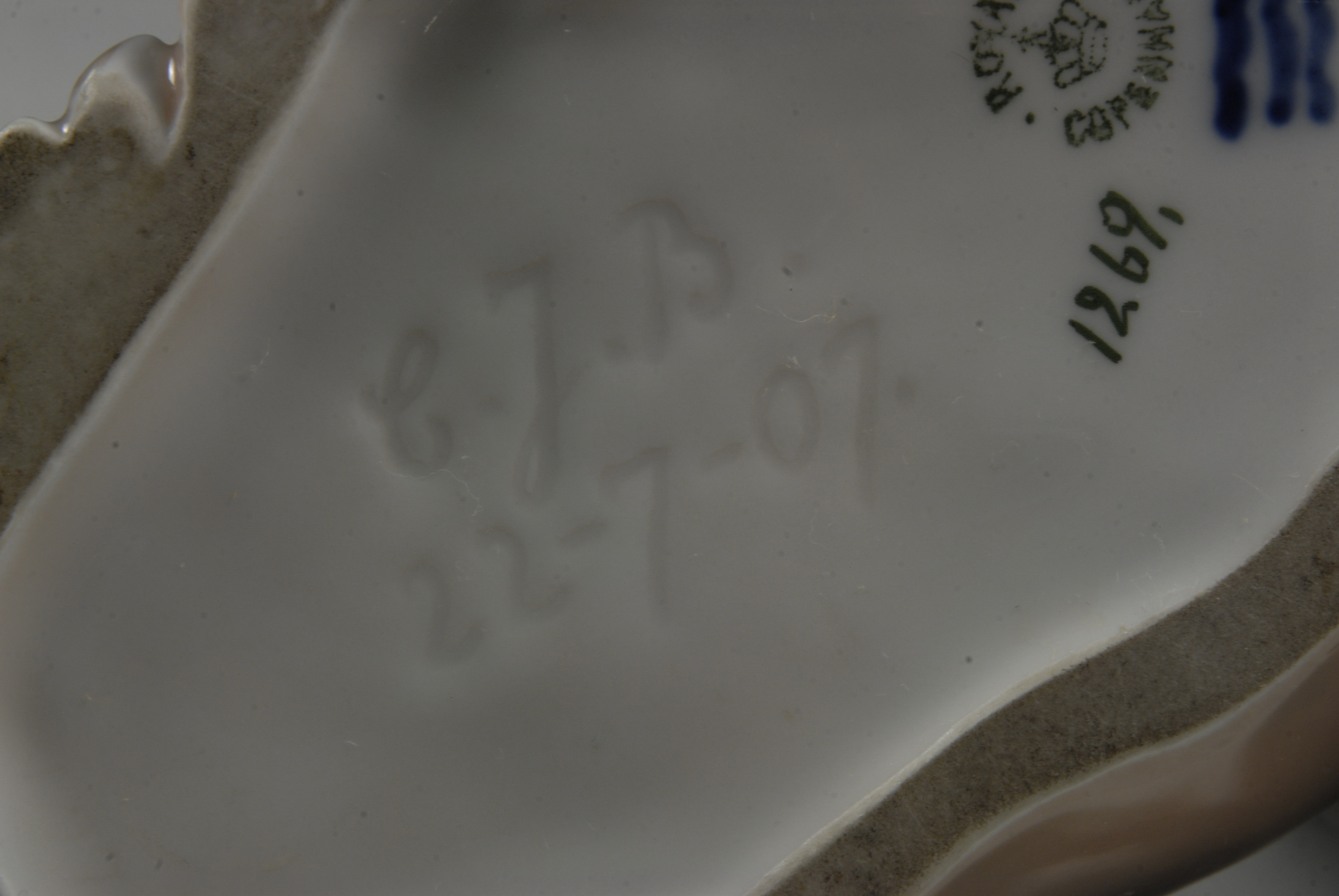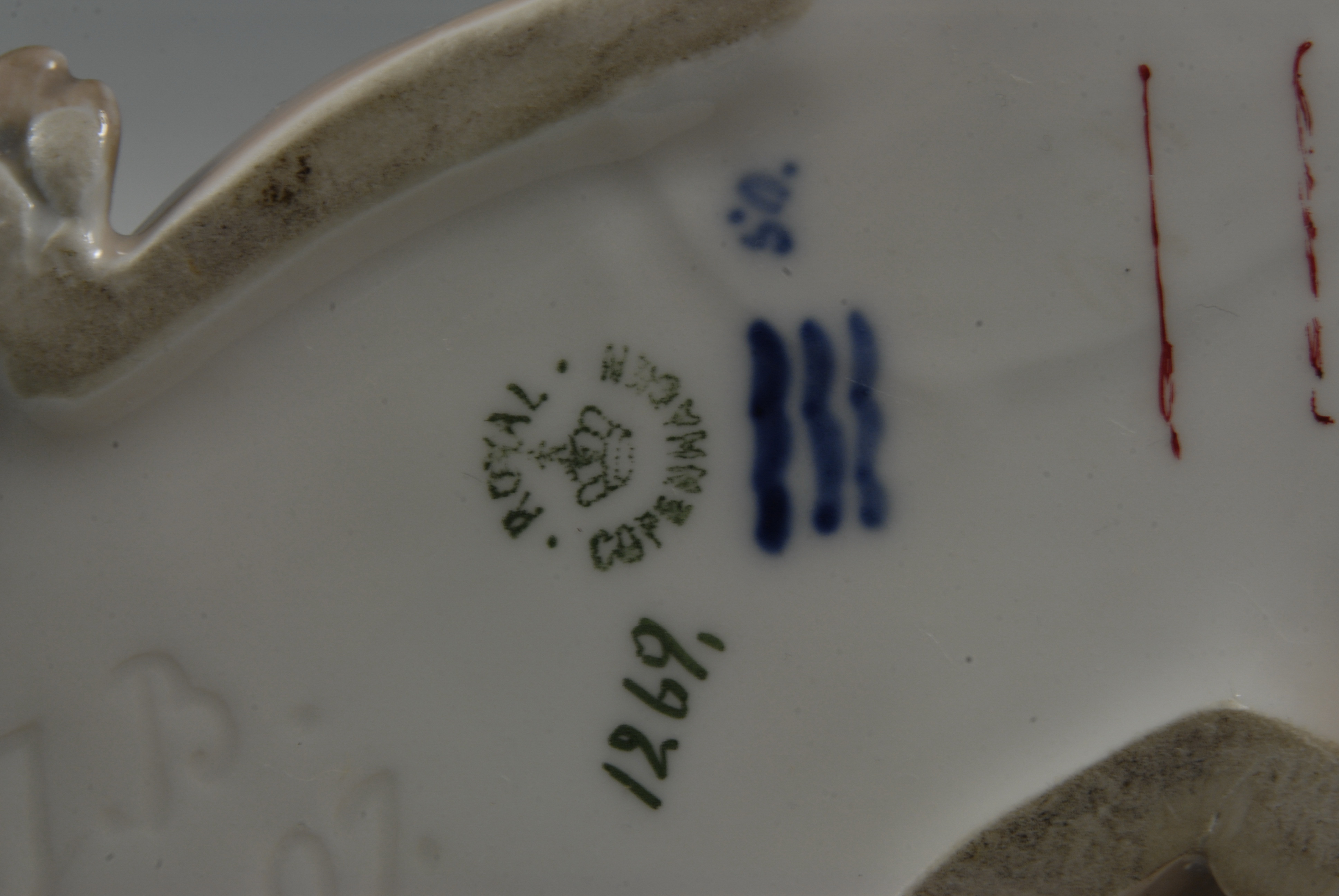 Авторські підписи, клейма: марка синя підглазурна: ... Марка зеленою фарбою: ... та цифри "50". Знаки в тісті: .../Історія Атрибуціi: консультація Р.С. Соловейчик (Ермітаж, 1961 р.) - Копенгаген,Королівський завод, к. 19 - п. 20 ст./Кількість: 1/Старі документи прийому: акт БВ № 1