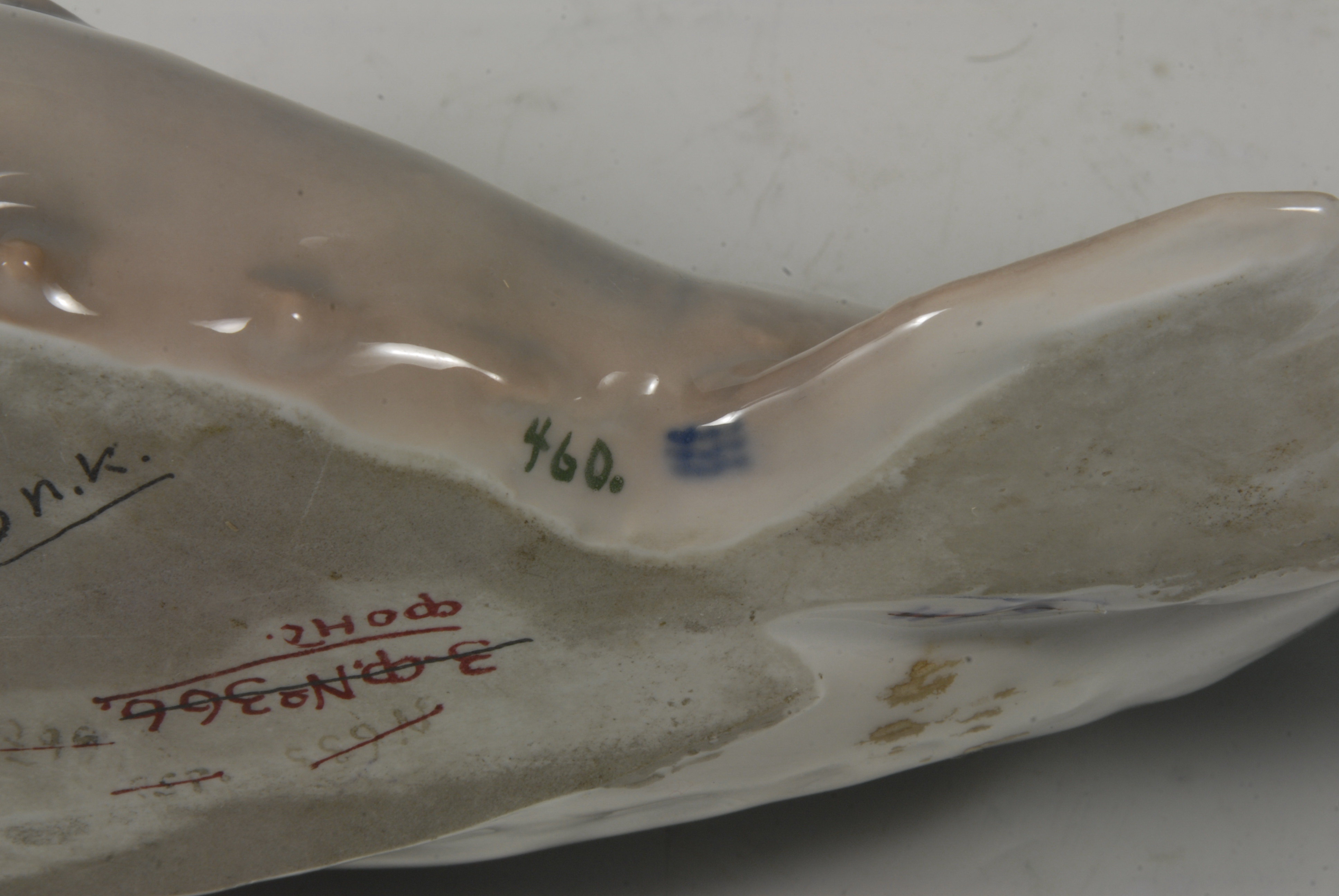 Авторські підписи, клейма: Марка синя підглазурна (з боку): ... Марка зеленою фарбою: ... В тісті: "460", "Н"/Історія Атрибуціi: консультація Р.С. Соловейчик (Ермітаж, 1961 р.) - Копенгаген, Королівський завод, к. 19 - п. 20 ст./Кількість: 1/Старі документи прийому: акт БВ № 1