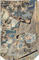 Комм.: На сайті (http://www.kuniyoshiproject.com/Warrior%20triptychs%201839-1841,%20Part%20II%20(T63-T82).htm) на аркуші вказано Publisher: Kawaguchi-ya Uhei). На нашому аркуші зрізано кути, де могли розташовуватися такі дані./Аналогіi: www.kuniyoshiproject.com/