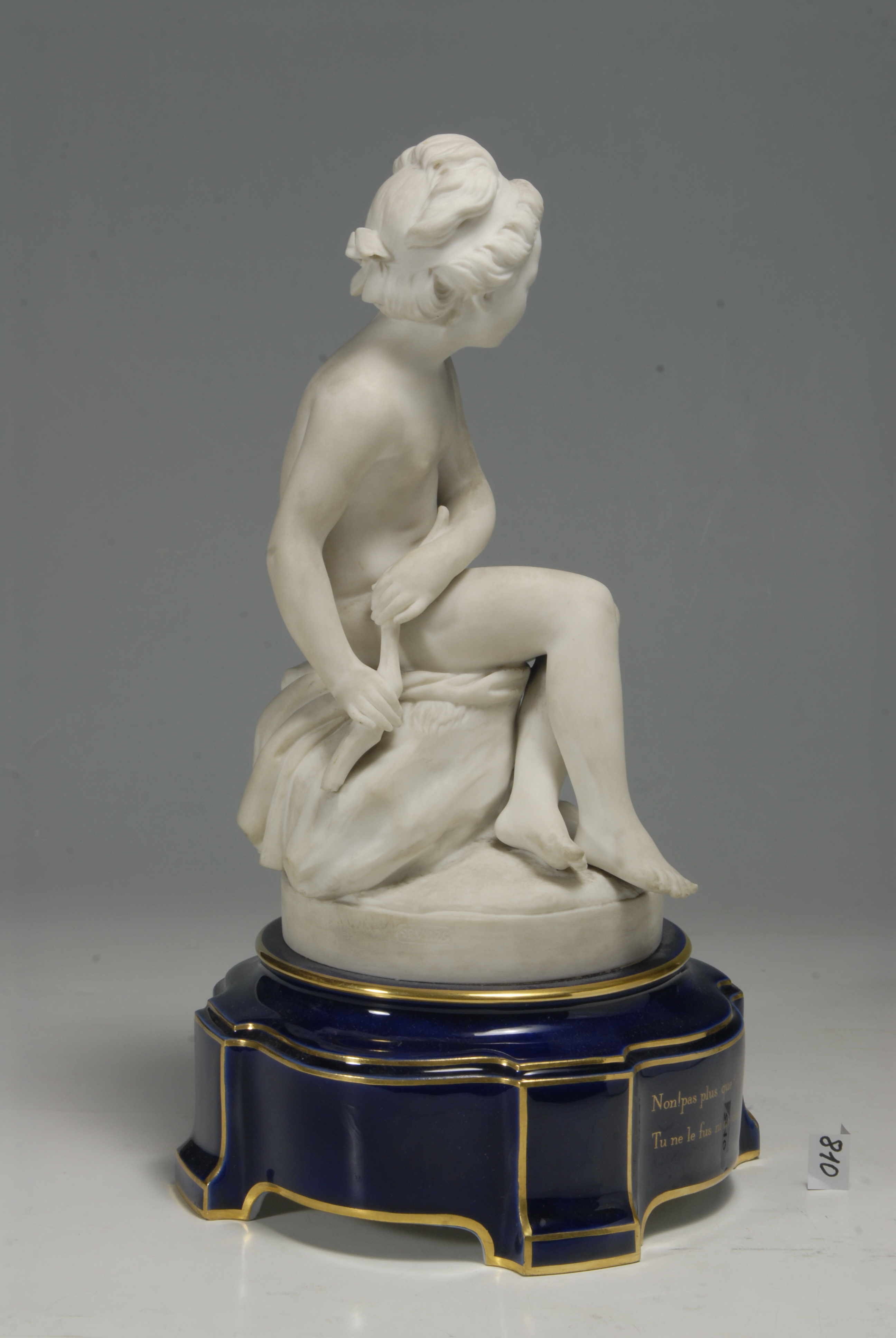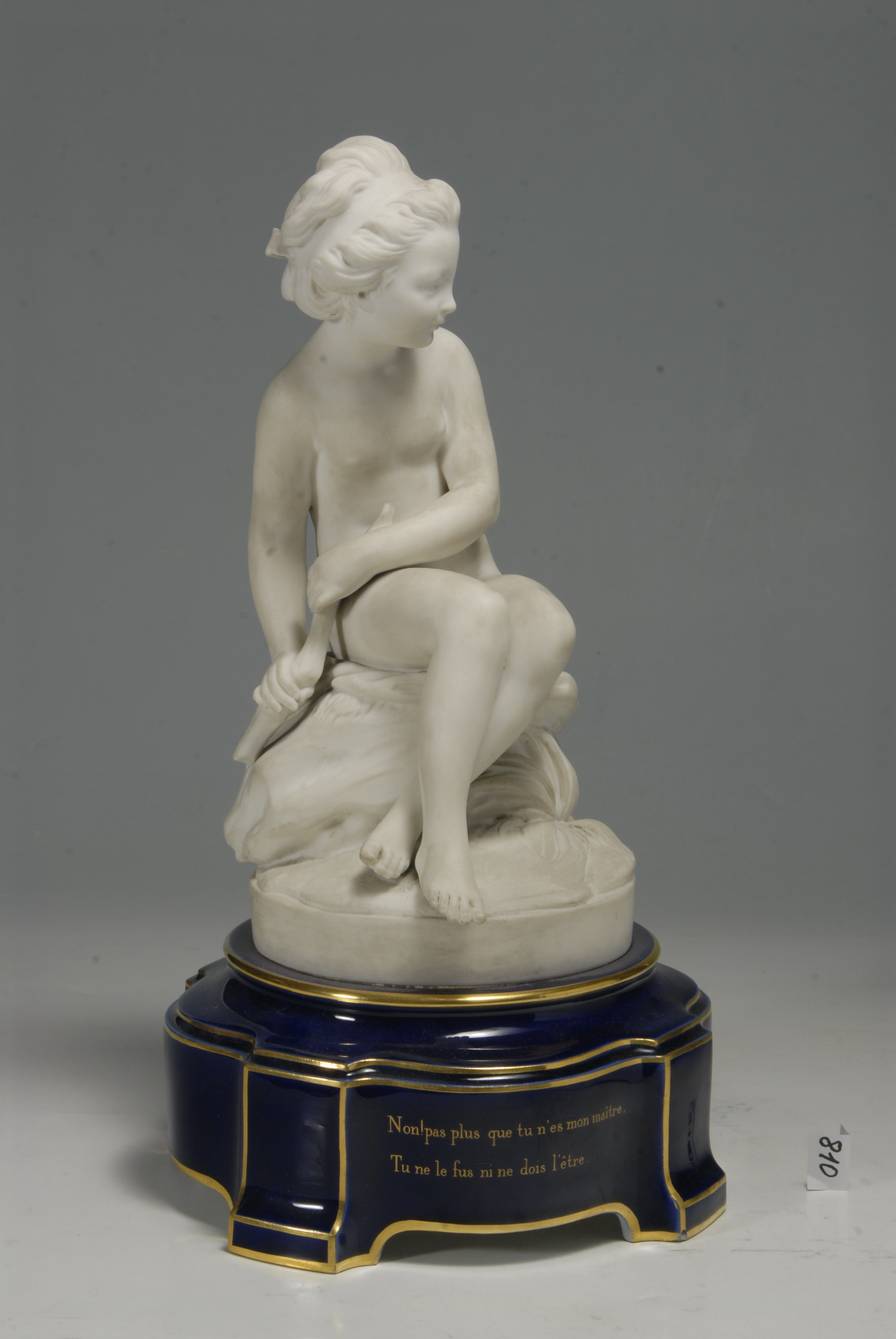 утрачено фрагмент лука; на внутрішній стороні підставки тріщина та відкол на ніжці. На драпіювання ззаду дві тріщини; на гомілці лівої ноги та на литці правої по чорній плямці.,