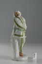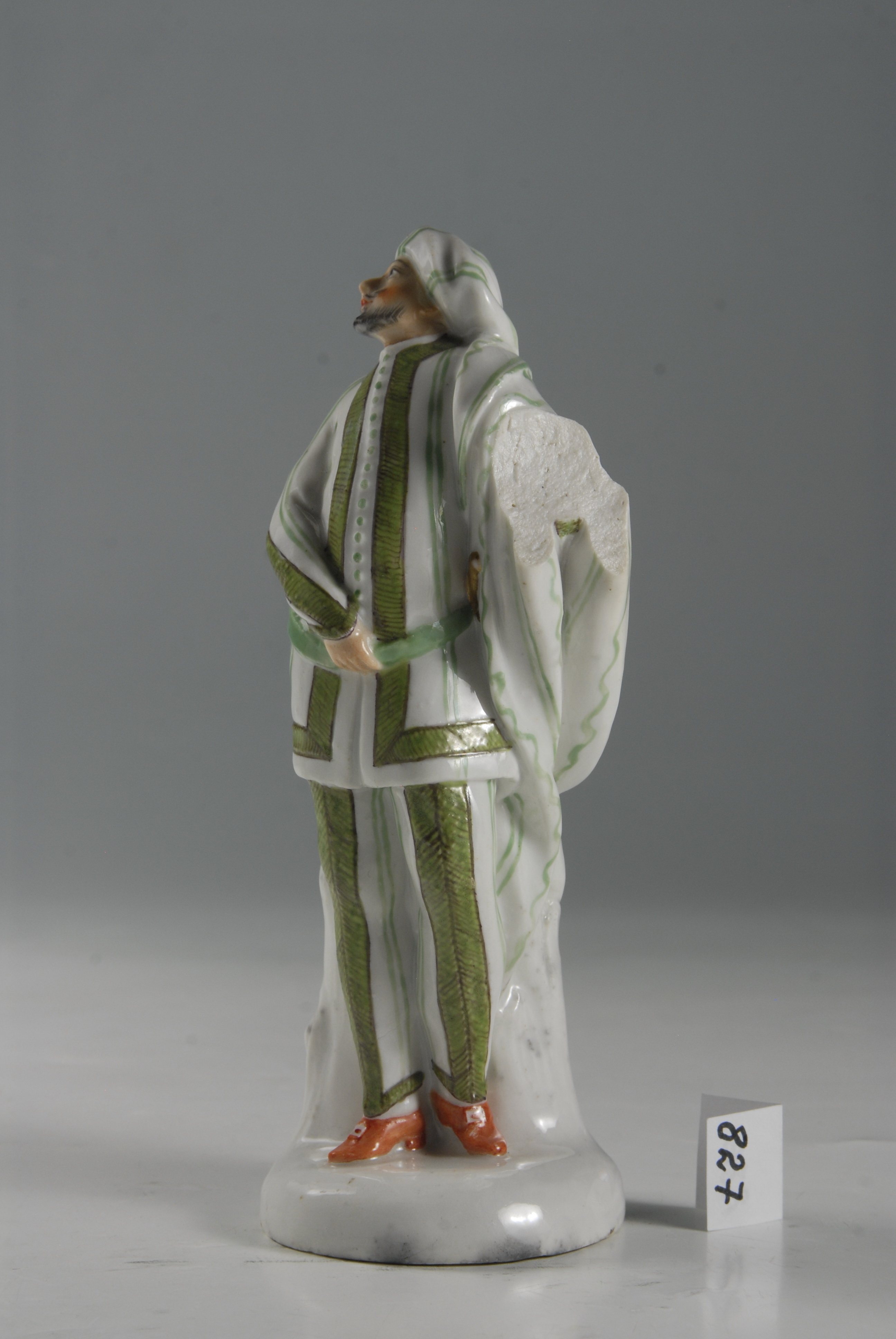 Авторські підписи, клейма: Без марки/Комм.: Зразками для серії фігур "Італійська комедія" були, надруковані в Аугсбургу в 1729 р. гравюри І.Б. Пробста, виконані за малюнками І.-Я. Шюблера (Johann Jacob Schubler). Ця модель, як і інші фігури серії, вперше правильно віднесена до Фейльсдорфської мануфактури Граулем (Graul R. und. Kurzwelly A. Altthuringer Porzellan. 1909, Taf. 56, Nr. 4). У каталозі збірки Євдокимових фігуру названо актором та віднесено до венеціанської порцеляни. У статті Брауна (Braun E.W. "Some Early Furstenberg Figures of Italian Comedians". The Burlington Magazine, vol. XIV, 1909, p. 222) фігуру названо Меццетином. Є екземпляри малого розміру ( Fruhwerke europaischer Porzellanmanufakturen. Sammlung Otto Blohm, beschrieben und eingeleitet von Robert Schmidt. 1953, Nr. 350), вони були також у збірці Букардта ( Die Sammlung Fritz Buckardt, Berlin. Beschrieben von Ludwig Schnorr v. Carolsfeld. Eingeleitet von Otto v. Falke. Aukt. Kat. Paul Cassirer und Hugo Helbing. 8. - 9. Dezember 1925, Nr. 128) та у збірці Журдана ( Sammlung Carl Jourdan, Frankfurt a. M. Bearbeitung von H. Carl Kruger. Rudolph Lepke, Aukt. Kat. Nr. 1585. 18. - 20. October 1910, Taf. 51). За деякими даними їх виконав учень Ньоя - Гьорінг (Goring) (Kramer E. "Tanzende Veilsdorfen Gartner". Die Weltkunst, 1971, Nr. 1 (1. Januar), S. 16)./Аналогіi: Соловкйчик Р.С. Фарфор заводов тюрингии XVIII - начала XIX века в Эрмитаже. Каталог. 1975, № 31/Кількість: 1/Модель, форма: модель 1764 - 1765 рр. за гравюрою І.-Б. Пробста, аркуш 2./Опис: Гобіель стоїть тримаючи праву руку біля талії за паском, через ліву (втрачено) перекинуто плащ; костюм білий з зеленими смугами та гофруванням, на голові берет з хвилястими зеленими лініями, такі самі лінії на плащі та штанах; черевики червоні; на лівому боці - руківя кинджалу. У Гобіеля вуса та коротка борідка. Підніжжя з пнем кругле біле.