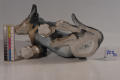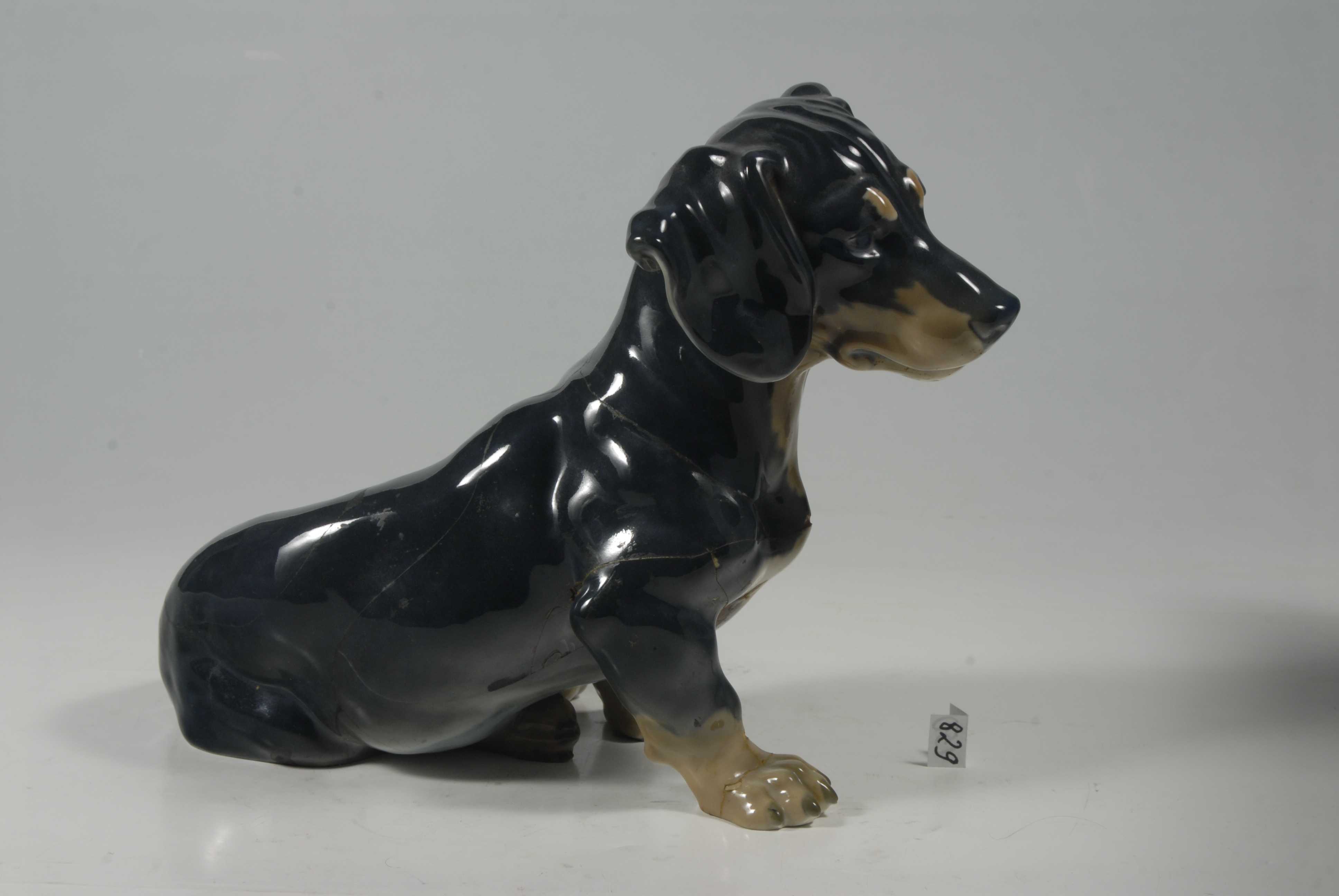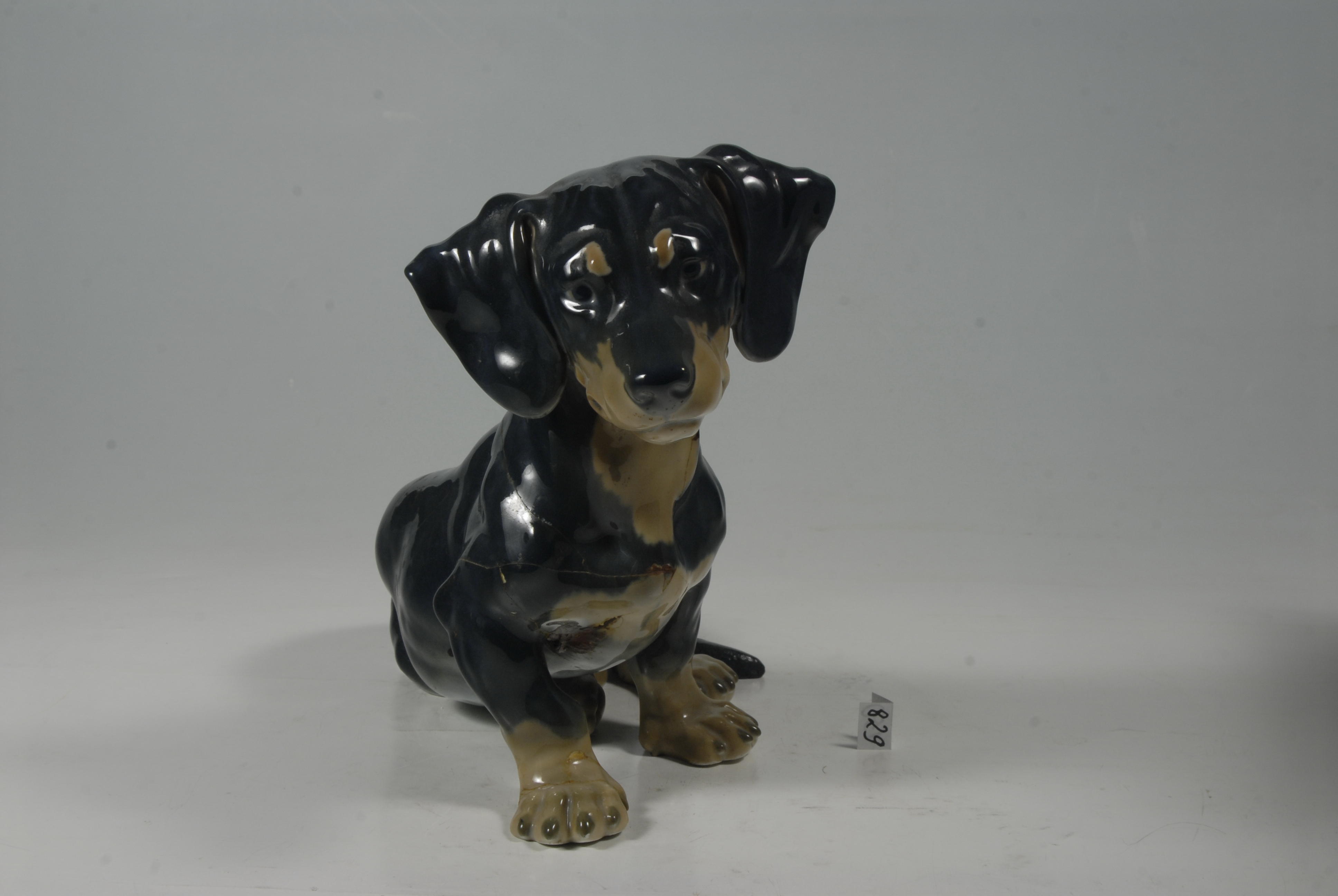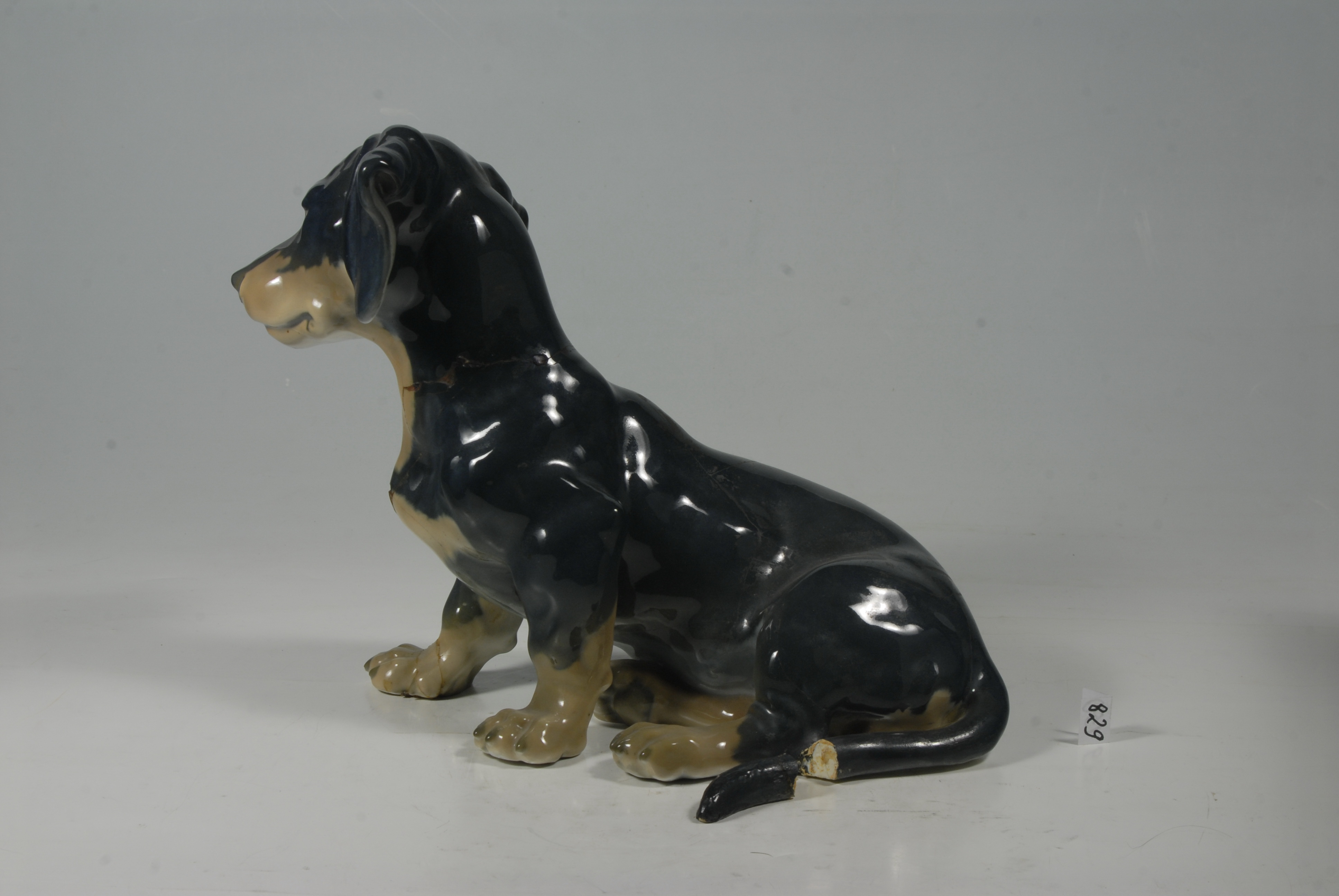 склеєна з численних фрагментів, по лінії шії та під передньою правою лапою з застосуванням пластиліну. Численні тріщини, дрібні втрати та відколи.,