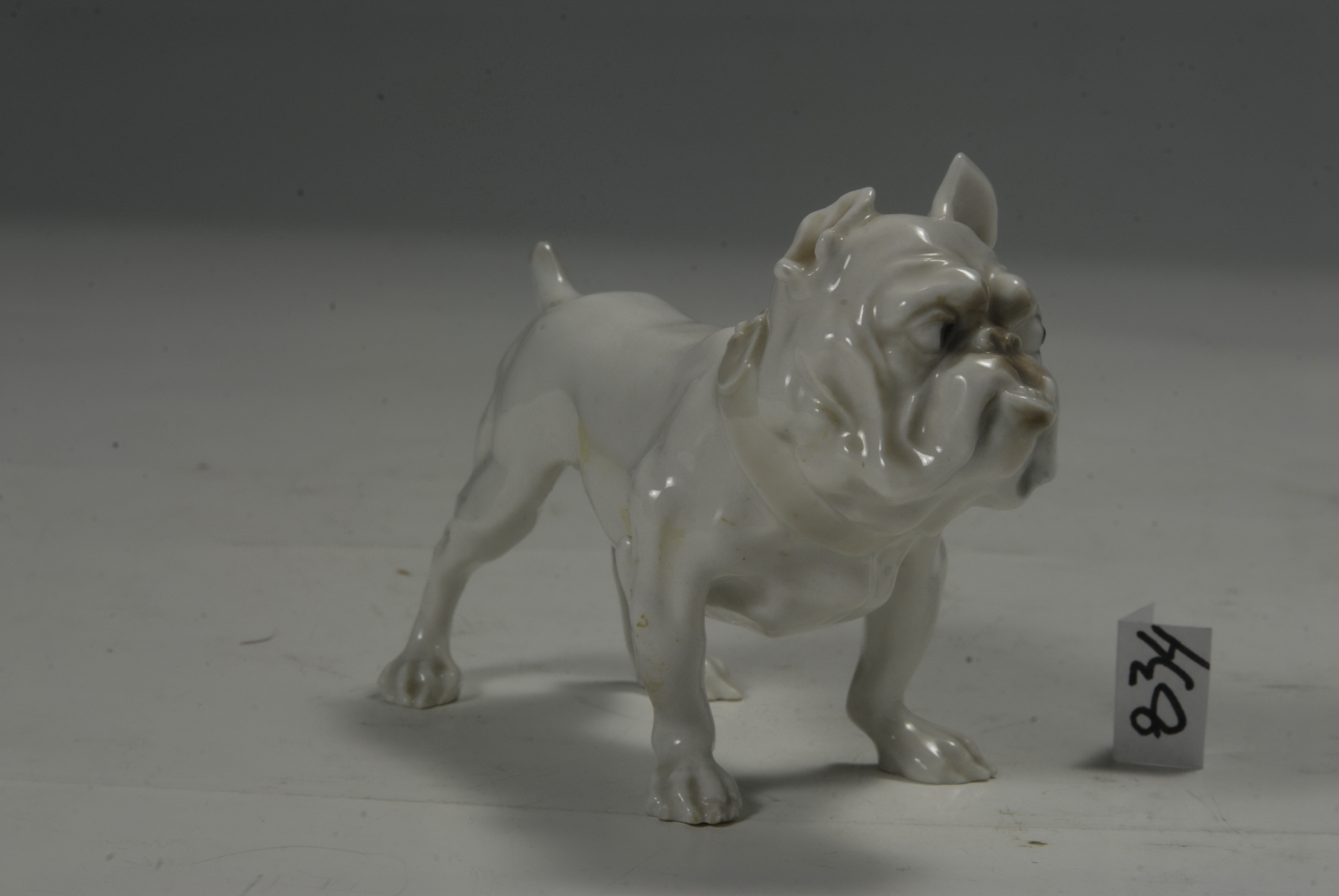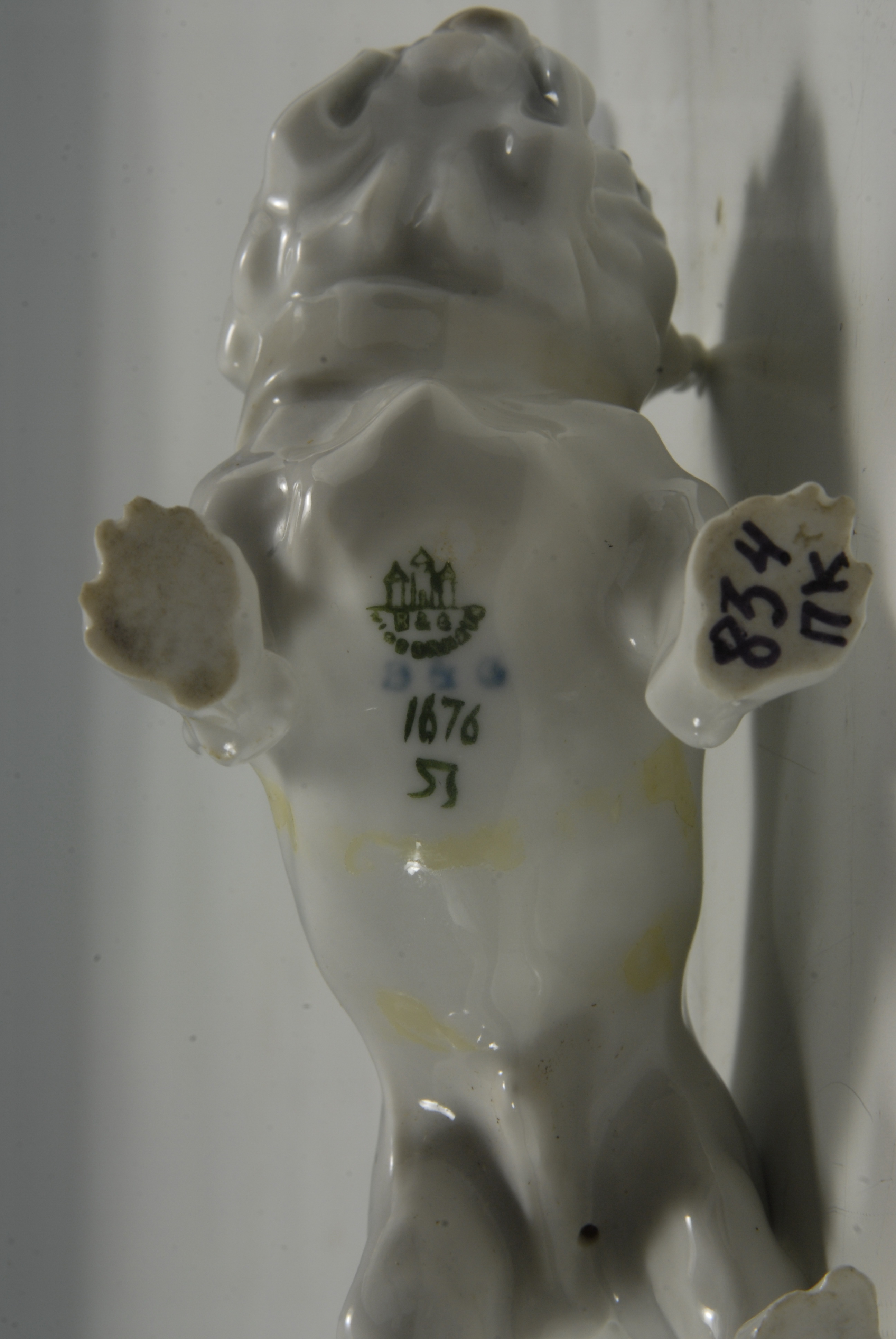 Авторські підписи, клейма: Марка синя підглазурна: літери B G. Зеленою фарбою: три вежі. Зеленою фарбою цифри: 1676 та 51. В тісті (на лівій передній лапі) літера: К/Кількість: 1